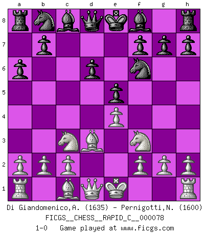 Last move : 1-0 2010 February 10 20:26:19 [Event "FICGS__CHESS__RAPID_C__000078"] [Site "FICGS"] [Date "2009.10.02"] [Round "1"] [White "Di Giandomenico,Alfonso"] [Black "Pernigotti,Nico"] [Result "1-0"] [WhiteElo "1635"] [BlackElo "1600"] 1.e4 c5 2.Nf3 d6 3.d4 cxd4 4.Nxd4 Nf6 5.Nc3 a6 6.Bd3 e5 7.Nf3 1-0 This chess game has been lost on time (started : 2009.10.02 15:2:47) Sicilian : Najdorf Player White won this chess game. Follow this game move after move (download)For me, Chess is life and every game is like a new life. Every Chess player gets to live many lives in one lifetime. (Eduard Gufeld) Ich verstehe Aljechins Kombinationen ganz gut; aber woher er diese Angriffschancen bekommt und wie er die Eröffnung behandelt das ist für mich ein Buch mit sieben Siegeln. (Rudolf Spielmann) Yo considero que Fischer es uno de los expertos mas grandes de aperturas de siempre. (Keith Hayward) Les écrivains ont utilisé les échecs pour analyser les côtés extrêmes de la nature humaine. Dans ce cadre, les échecs offrent un champ d'expérimentation idéal. Mais on pourrait faire la même chose avec la peinture. Et là, en vous référant à Van Gogh, vous ne tirerez pas de conclusion définitive sur les peintres. (Gary Kasparov) Horse racing is animated roulette. (Roger Kahn)