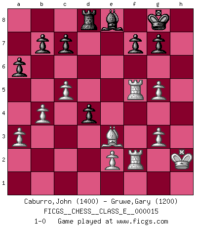Last move : 1-0 2006 November 14 13:16:15 [Event "FICGS__CHESS__CLASS_E__000015"] [Site "FICGS"] [Date "2006.09.28"] [Round "1"] [White "Caburro,John"] [Black "Gruwe,Gary"] [Result "1-0"] [WhiteElo "1400"] [BlackElo "1200"] 1.a3 d5 2.h3 e5 3.c4 d4 4.d3 Nf6 5.Nf3 Nc6 6.b4 Bd6 7.c5 Be7 8.g3 Be6 9.Bg2 O-O 10.O-O h6 11.Bb2 Qd7 12.Kh2 a6 13.Nbd2 Nd5 14.Nc4 Bf6 15.Qc2 Rae8 16.Rac1 Rd8 17.Nfd2 Bg5 18.h4 Bxd2 19.Qxd2 Nf6 20.Bxc6 Ng4+ 21.Kg1 Qxc6 22.f3 Bxc4 23.fxg4 Bd5 24.Rf2 Qg6 25.g5 hxg5 26.Qxg5 Qxg5 27.hxg5 Bc6 28.Rf5 Rfe8 29.Rcf1 Re7 30.Kh2 Be8 31.Bc1 e4 32.dxe4 Rxe4 33.R1f2 Re3 34.Bxe3 1-0 Anderssen's Opening Kingside Castling by player Black (move 9) Kingside Castling by player White (move 10) Player White won this chess game. Follow this game move after move (download)Do you realize Fischer almost never has any bad pieces? He exchanges them, and the bad pieces remain with his opponents. (Yuri Balashov) Das Schach ist nichts für kleine Geister, es beansprucht einen vollen Mann, der sich nicht sklavisch an das Überlieferte hält, sondern selbständig die Tiefen des Spiels zu ergründen sucht. (Wilhelm Steinitz) Cualquier cambio de material en una posición debe venir por medio de un mate, una captura o promoción de Peón. (Purdy) Lorsque vous vous retrouvez devant une position atroce, ne tendez pas un ultime piège dérisoire avec l'intention d'abandonner si l'adversaire le déjoue ! Faites-vous plutôt un devoir de résister comme si votre vie en dépendait. Jouez le coup qui vous déplairait au centuple si vous étiez dans la peau de votre tortionnaire ! I've never seen so many men wasted so badly. (Blondie in The Good, The Bad and The Ugly)