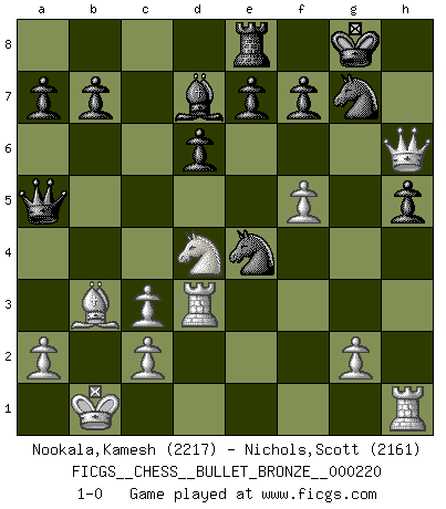 Last move : 1-0 2010 April 17 15:53:27 [Event "FICGS__CHESS__BULLET_BRONZE__000220"] [Site "FICGS"] [Date "2010.04.17"] [Round "1"] [White "Nookala,Kamesh"] [Black "Nichols,Scott"] [Result "1-0"] [WhiteElo "2217"] [BlackElo "2161"] 1.e4 c5 2.Nf3 d6 3.d4 cxd4 4.Nxd4 Nf6 5.Nc3 g6 6.Be3 Bg7 7.f3 O-O 8.Qd2 Nc6 9.Bc4 Bd7 10.O-O-O Qa5 11.Bb3 Rfc8 12.Kb1 Ne5 13.h4 Rab8 14.h5 Nxh5 15.Bh6 Rxc3 16.Bxg7 Nxg7 17.bxc3 h5 18.f4 Ng4 19.f5 gxf5 20.exf5 Re8 21.Qg5 Nf6 22.Rd3 Ne4 23.Qh6 1-0 Sicilian : Dragon, Yugoslav attack, 7...O-O Kingside Castling by player Black (move 7) Queenside Castling by player White (move 10) Player White won this chess game. Follow this game move after move (download)At this time Fischer is simply a level above all the best Chessplayers in the world. (John Jacobs) Ich bin stolz ein Bulgare zu sein. (Veselin Topalov) Todos los Maestros de Ajedrez fueron un día unos principiantes. (Chernev) Le système Elo représente seulement une moyenne. Il est simplement un indicateur de votre stabilité. (Anatoli Karpov) The good fighters of old first put themselves beyond the possibility of defeat, and then waited for an opportunity of defeating the enemy. (Sun Tzu)
