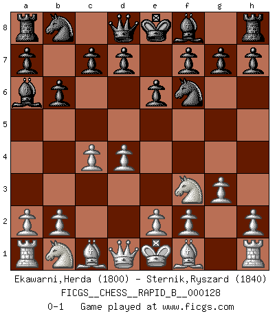 Last move : 0-1 2009 November 14 20:53:14 [Event "FICGS__CHESS__RAPID_B__000128"] [Site "FICGS"] [Date "2009.10.09"] [Round "1"] [White "Ekawarni,Herda"] [Black "Sternik,Ryszard"] [Result "0-1"] [WhiteElo "1800"] [BlackElo "1840"] 1.d4 Nf6 2.c4 e6 3.Nf3 b6 4.g3 Ba6 0-1 This chess game has been lost on time (started : 2009.10.09 10:59:58) Queen's Indian : Nimzovich variation (exaggerated Fianchetto) Player Black won this chess game. Follow this game move after move (download)By this measure (on the gap between Fischer & his contemporaries), I consider him the greatest world champion. (Garry Kasparov) Du kannst im Schach nur gut werden, wenn du das Spiel liebst. (Robert James Fischer) El Ajedrez es un juego terrible. Si no dominas el centro, tu oponente tiene una posición mas libre. Si tu tienes el centro, entonces realmente tienes algo de que preocuparte. (Siegbert Tarrasch) En blitz, le Cavalier l'emporte sur le Fou. (Vlastimil Hort) If only people were all showed a certain minimum level of niceness; if only people didn't retract verbal draw offers (without draw box ticked) on ficgs; if only people didn't kill; if only people didn't run concentration / extermination camps, if only people didn't drop nuclear bombs on Hiroshima and Nagasaki, and so on - it would be a much more beautiful world. But sadly, things are not so... (Normajean Yates)