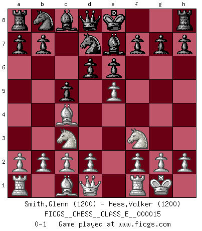 Last move : 0-1 2006 November 8 21:47:57 [Event "FICGS__CHESS__CLASS_E__000015"] [Site "FICGS"] [Date "2006.09.28"] [Round "1"] [White "Smith,Glenn"] [Black "Hess,Volker"] [Result "0-1"] [WhiteElo "1200"] [BlackElo "1200"] 1.e4 c5 2.Nf3 d6 3.Bc4 e6 4.Nc3 Nf6 5.O-O Be7 6.e5 Nfd7 0-1 This chess game has been lost on time (started : 2006.09.28 13:54:40) Sicilian Kingside Castling by player White (move 5) Player Black won this chess game. Follow this game move after move (download)Chess books should be used as we use glasses: to assist the sight, although some players make use of them as if they thought they conferred sight. (Jose Raul Capablanca) Wie bekannt hörte Morphy 1859 auf, Schach zu spielen. Seine Enttäuschung galt nicht so sehr dem Schach, wie den Schachspielern. (Robert James Fischer) Debemos de asegurarnos de que el Ajedrez no se convierta en un lenguaje muerto, muy interesante, pero tan solo para un grupo muy pequeño. (Sytze Faber) 'L'échange des dames est un coup dur pour les deux adversaires...' Un journaliste lors d'une partie du match Spassky-Fischer The only difference between a tax man and a taxidermist is that the taxidermist leaves the skin. (Mark Twain)