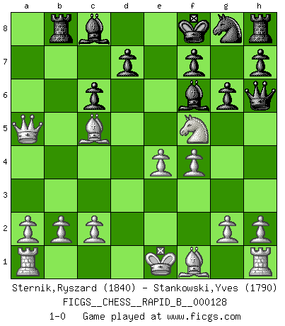 Last move : 1-0 2009 November 27 0:25:7 [Event "FICGS__CHESS__RAPID_B__000128"] [Site "FICGS"] [Date "2009.10.09"] [Round "1"] [White "Sternik,Ryszard"] [Black "Stankowski,Yves"] [Result "1-0"] [WhiteElo "1840"] [BlackElo "1790"] 1.e4 c5 2.Nc3 Nc6 3.Nf3 g6 4.d4 cxd4 5.Nxd4 Bg7 6.Be3 a6 7.Nd5 e6 8.Nxc6 bxc6 9.Bb6 Qg5 10.f4 Qh6 11.Nc7+ Ke7 12.Qd2 Rb8 13.Bc5+ Kd8 14.Qa5 Bf6 15.Nxa6 Ke8 16.Nc7+ Kd8 17.Nxe6+ Ke8 18.Nc7+ Kd8 19.Nb5 Ke8 20.Nd6+ Kf8 21.Nf5 1-0 Sicilian : Closed, 2...Nc6 Player White won this chess game. Follow this game move after move (download)It is difficult to play against Einstein's theory --on his first loss to Fischer. (Mikhail Tal) Es ist nicht das erste mal, dass sich die FIDE dem Arabischen Geld gebeugt hat (über die FIDE WM 2004 in Lybien). (Larry Evans) Por la belleza de sus partidas, la claridad de su juego y lo brillante de sus ideas, Fischer se creó el mismo como un artista de la misma estatura como Brahms, Rembrandt y Shakespeare. (David Levy) Les sacrifices démontrent seulement que quelqu'un a gaffé. (Savielly Tartacover) You can only get smarter by playing a smarter opponent. (Revolver, movie)