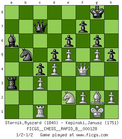 Last move : 1/2-1/2 2009 December 9 22:26:48 [Event "FICGS__CHESS__RAPID_B__000128"] [Site "FICGS"] [Date "2009.10.09"] [Round "1"] [White "Sternik,Ryszard"] [Black "Kepinski,Janusz"] [Result "1/2-1/2"] [WhiteElo "1840"] [BlackElo "1751"] 1.e4 e6 2.Qe2 c5 3.Nf3 Nc6 4.g3 Nge7 5.Bg2 g6 6.O-O d5 7.d3 Bg7 8.e5 O-O 9.c3 Qb6 10.Re1 Re8 11.Na3 a6 12.Rb1 Qc7 13.Nc2 b5 14.Bf4 Bb7 15.d4 c4 16.Qd2 Nf5 17.g4 Nfe7 18.Bh6 Kh8 19.Bxg7+ Kxg7 20.Qf4 h6 21.Ne3 Rf8 22.g5 h5 23.b4 a5 24.a4 Ba6 25.axb5 Bxb5 26.bxa5 Rxa5 27.Rb2 Kg8 28.Reb1 Rb8 29.Nd2 Ba6 30.Rxb8+ Nxb8 31.Nc2 Ra2 32.Nb4 Ra3 33.Rc1 Nbc6 34.Nxc6 Nxc6 35.Nf1 Na7 36.Ng3 Nb5 37.Ne2 1/2-1/2 French : Chigorin variation Kingside Castling by player White (move 6) Kingside Castling by player Black (move 8) This chess game ended in a draw. Follow this game move after move (download)I had a toothache during the first game. In the second game I had a headache. In the third game it was an attack of rheumatism. In the fourth game, I wasn't feeling well. And in the fifth game? Well, must one have to win every game ? (Siegbert Tarrasch) Über Kasparov: Es ist offensichtlich, daß er in einem totalitären Staat aufwuchs und deshalb zu diktatorischen Zügen neigt. (Viktor Kortschnoi) El Ajedrez es tan interesante por sí solo, que no es necesario un interés monetario para persuadir a una persona a que lo practique; por lo tanto, nunca se juega por dinero. (Benjamin Franklin) Des combinaisons [dans le jeu d'échecs] pareilles à des mélodies. Je crois entendre pour ainsi dire la musique des coups... (Vladimir Nabokov) History is a gallery of pictures in which there are few originals and many copies. (Alexis de Tocqueville)
