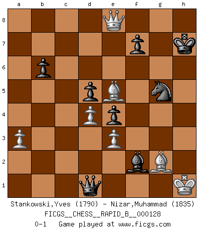 Last move : 0-1 2010 February 15 20:50:42 [Event "FICGS__CHESS__RAPID_B__000128"] [Site "FICGS"] [Date "2009.10.09"] [Round "1"] [White "Stankowski,Yves"] [Black "Nizar,Muhammad"] [Result "0-1"] [WhiteElo "1790"] [BlackElo "1835"] 1.c4 e5 2.Nc3 Nf6 3.g3 Bb4 4.Bg2 O-O 5.e3 c6 6.Nge2 d5 7.cxd5 cxd5 8.O-O Nc6 9.a3 Be7 10.d4 e4 11.Nf4 Bg4 12.Qb3 Na5 13.Qc2 g5 14.Nfe2 Qb6 15.b4 Qc6 16.bxa5 Bxe2 17.Qxe2 Qxc3 18.Bd2 Qc8 19.Rfc1 Qd7 20.Bb4 Rfc8 21.Qb2 Bd8 22.Qe2 Qa4 23.Qd2 Qd7 24.Rxc8 Rxc8 25.Rc1 h5 26.Rc5 Rxc5 27.Bxc5 b6 28.axb6 axb6 29.Bb4 h4 30.h3 g4 31.hxg4 Qxg4 32.gxh4 Nh7 33.Bd6 Bxh4 34.Qc2 Ng5 35.Qa4 Qe2 36.Qe8+ Kh7 37.Be5 Bxf2+ 38.Kh1 Qd1+ 0-1 This chess game has been lost on time (started : 2009.10.09 10:59:58) English : Bremen, Smyslov system Kingside Castling by player Black (move 4) Kingside Castling by player White (move 8) Player Black won this chess game. Follow this game move after move (download)All I want to do, ever, is just play Chess. (Bobby Fischer) Ohne ihre Erfolge schmälern zu wollen würde ich sagen Petrosian, Spassky und Karpov verdanken ihre Siege ihren Trainern - Boleslavsky, Bondarevsky und Furman. (Mikhail Moiseyevich Botvinik) Tu cuerpo tiene que estar en óptima condición. Tu Ajedrez se deteriora como lo hace tu cuerpo. No puedes separar la mente y el cuerpo. (Bobby Fischer) Roi des jeux et jeu des rois, les échecs portent en eux un sentiment d'infini. Ils donnent à celui qui s'est efforcé d'en approfondir les arcanes l'impression de n'être pas à la mesure de l'homme; en fait, ils constituent un résumé de l'univers, un microcosme, et figurent cette grande échelle qui, dans les plans de la lumière descend jusqu'à la matière, qui des abîmes insondables remonte jusqu'en l'infini de Dieu. (Pyrame) The beginning is the most important part of the work. (Plato)