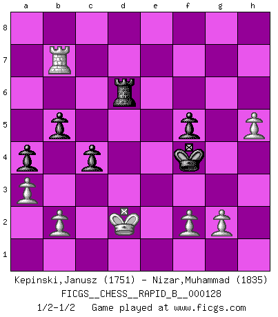 Last move : 1/2-1/2 2010 February 15 17:13:2 [Event "FICGS__CHESS__RAPID_B__000128"] [Site "FICGS"] [Date "2009.10.09"] [Round "1"] [White "Kepinski,Janusz"] [Black "Nizar,Muhammad"] [Result "1/2-1/2"] [WhiteElo "1751"] [BlackElo "1835"] 1.d4 d5 2.c4 c6 3.e3 Nf6 4.Nf3 Bf5 5.Bd3 Bxd3 6.Qxd3 e6 7.O-O Bd6 8.cxd5 exd5 9.Re1 O-O 10.Nc3 Nbd7 11.Bd2 Re8 12.e4 dxe4 13.Nxe4 Bc7 14.Bg5 h6 15.Nxf6+ Nxf6 16.Rxe8+ Qxe8 17.Bxf6 gxf6 18.Re1 Qd7 19.Qe3 Kg7 20.Qe4 f5 21.Qe7 Qd8 22.Kf1 Rb8 23.a3 Rc8 24.Qxd8 Rxd8 25.Re7 Rc8 26.Ne5 Bxe5 27.dxe5 Rb8 28.e6 Kf6 29.Rxf7+ Kxe6 30.Rh7 c5 31.Rxh6+ Ke5 32.Rh7 a5 33.h4 c4 34.Rc7 Kd4 35.Rd7+ Ke5 36.Ke2 b5 37.Ra7 a4 38.h5 Rb6 39.Kd2 Rd6+ 40.Ke2 Re6 41.Rb7 Kf4 42.Kd2 Rd6+ 1/2-1/2 QGD Slav defense Kingside Castling by player White (move 7) Kingside Castling by player Black (move 9) This chess game ended in a draw. Follow this game move after move (download)We must make sure that Chess will not be like a dead language, very interesting, but for a very small group. (Sytze Faber) Frage: Was machen Sie mit den Preisen? Anwort: Ich habe Angst, dass meine Freundin davon neue Kleider kauft. (Loek van Wely) Después de una mala apertura, hay una esperanza en el juego medio. Pero una vez que estas en finales, el momento de la verdad ha llegado. (Edmar Mednis) Mais n'est-ce pas déjà le limiter injurieusement que d'appeler les échecs un jeu? N'est-ce pas aussi une science, un art, ou quelque chose qui, comme le cercueil de Mahomet entre ciel et terre, est suspendu entre l'un et l'autre, et qui réunit un nombre incroyable de contraires ? (Stefan Zweig) A computer lets you make more mistakes faster than any invention in human history - with the possible exceptions of handguns and tequila. (Mitch Ratcliffe)