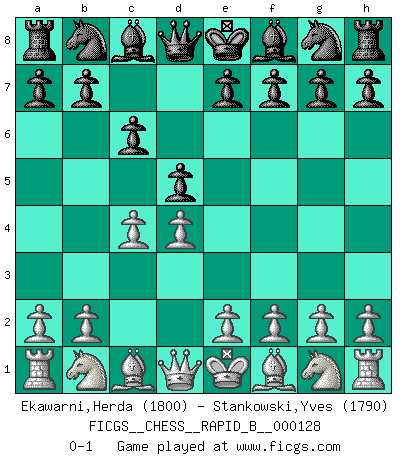 Last move : 0-1 2009 November 18 8:20:44 [Event "FICGS__CHESS__RAPID_B__000128"] [Site "FICGS"] [Date "2009.10.09"] [Round "1"] [White "Ekawarni,Herda"] [Black "Stankowski,Yves"] [Result "0-1"] [WhiteElo "1800"] [BlackElo "1790"] 1.d4 d5 2.c4 c6 0-1 This chess game has been lost on time (started : 2009.10.09 10:59:58) QGD Slav defense Player Black won this chess game. Follow this game move after move (download)We must make sure that Chess will not be like a dead language, very interesting, but for a very small group. (Sytze Faber) Modernes Schach erfordert enorme Anspannung. Es ist für einen normalen Menschen unmöglich das auszuhalten. (Viktor Kortschnoi) Tu sabes, camarada Pachman, no disfruto el ser un Ministro, preferería jugar al Ajedrez como tu. (Che Guevara) Demandez au pauvre Cg1 ce qu'il en pense. Eduard Gufeld à propos de la variante Saemisch de l'Est-Indienne. Winning isn't everything... but losing is nothing. (Mednis)