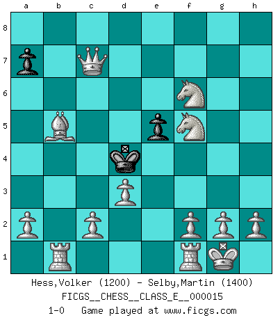 Last move : 1-0 2006 October 3 17:25:50 [Event "FICGS__CHESS__CLASS_E__000015"] [Site "FICGS"] [Date "2006.09.28"] [Round "1"] [White "Hess,Volker"] [Black "Selby,Martin"] [Result "1-0"] [WhiteElo "1200"] [BlackElo "1400"] 1.e4 e5 2.Nf3 Nc6 3.Bb5 Qf6 4.O-O Bc5 5.Nc3 Nh6 6.d3 d6 7.Nd5 Qd8 8.Bg5 f6 9.Bxh6 gxh6 10.Bxc6+ Bd7 11.Bxb7 Rb8 12.Ba6 Rxb2 13.Bc4 c6 14.Nc3 Bb4 15.Na4 Qa5 16.Nxb2 Bc3 17.Rb1 Qb4 18.Bb3 Qa3 19.Nc4 Qc5 20.Nh4 d5 21.Qh5+ Kd8 22.exd5 cxd5 23.Ne3 Rg8 24.Nxd5 Ba4 25.Nxf6 Rf8 26.Nxh7 Be8 27.Qxh6 Rh8 28.Qf6+ Kc7 29.Qxh8 Bd2 30.Qxe8 Ba5 31.Qf7+ Kc6 32.Nf6 Bc7 33.Ba4+ Qb5 34.Bxb5+ Kd6 35.Qd7+ Kc5 36.Qxc7+ Kd4 37.Nf5+ 1-0 Comment by player 2 : Martin Selby : Very well played Ruy Lopez (Spanish Opening) Kingside Castling by player White (move 4) Player White won this chess game. Follow this game move after move (download)Pawns are born free, yet they are everywhere in chains. (Rick Kennedy) Habe Mut, dich deines eigenen Verstandes zu bedienen. (Immanuel Kant) ¿Que sería del Ajedrez sin errores graciosos?. (Kurt Richter) Les échecs, c'est l'imagination. (David Bronstein) Home computers are being called upon to perform many new functions, including the consumption of homework formerly eaten by the dog. (Doug Larson)