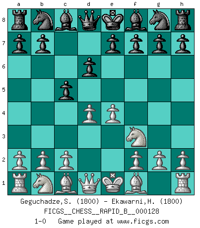 Last move : 1-0 2009 November 22 8:39:28 [Event "FICGS__CHESS__RAPID_B__000128"] [Site "FICGS"] [Date "2009.10.09"] [Round "1"] [White "Geguchadze,Sandro"] [Black "Ekawarni,Herda"] [Result "1-0"] [WhiteElo "1800"] [BlackElo "1800"] 1.e4 c5 2.Nf3 d6 3.d4 1-0 This chess game has been lost on time (started : 2009.10.09 10:59:58) Sicilian Player White won this chess game. Follow this game move after move (download)Bobby Fischer's current state of mind is indeed a tragedy. One of the world's greatest Chess players - the pride and sorrow of American Chess. (Frank Brady) Strategie ist, wie man ein Mädchen auf den Rücksitz bekommt. Taktik ist, was man tut, wenn man dann dort ist. (Anonymous) Vive, pierde y aprende al observar a tu oponente como gana. (Amber Steenbock) Nous vivons dans un monde échiquéen : chaque jour qui passe est un défi à relever. (Philosophe Sasha) Wisdom is the reward you get for a lifetime of listening when you'd have preferred to talk. (Doug Larson)