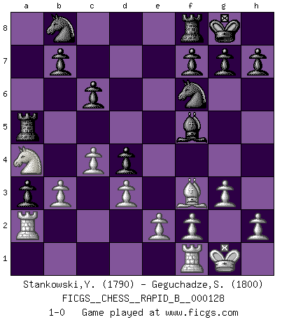 Last move : 1-0 2010 January 31 8:39:44 [Event "FICGS__CHESS__RAPID_B__000128"] [Site "FICGS"] [Date "2009.10.09"] [Round "1"] [White "Stankowski,Yves"] [Black "Geguchadze,Sandro"] [Result "1-0"] [WhiteElo "1790"] [BlackElo "1800"] 1.c4 Nf6 2.Nc3 e5 3.g3 c6 4.Bg2 d5 5.b3 Bf5 6.Nf3 d4 7.Na4 Bb4 8.O-O e4 9.d3 exf3 10.Bxf3 O-O 11.Bd2 a5 12.Bxb4 axb4 13.Qd2 Qa5 14.a3 bxa3 15.Qxa5 Rxa5 16.Ra2 1-0 This chess game has been lost on time (started : 2009.10.09 10:59:58) English Opening Kingside Castling by player White (move 8) Kingside Castling by player Black (move 10) Player White won this chess game. Follow this game move after move (download)A thorough understanding of the typical mating continuations makes the most complicated sacrificial combinations leading up to them not only not difficult, but almost a matter of course. (Siegbert Tarrasch) Ein Teil des Fehlers ist immer korrekt. (Savielly Grigorievitsch Tartakower) Dejen al perfeccionista jugar por correo. (Yasser Seirawan) Le profane ne songe pas à la somme de jouissance dont il se prive, qui méconnaît ce jeu aux ressources aussi variées que passionnantes. (Jean-Marie Jeanton-Lamarche) Fortune favours the audacious. (Desiderius Erasmus)