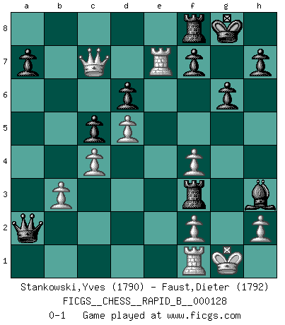 Last move : 0-1 2009 December 18 12:58:11 [Event "FICGS__CHESS__RAPID_B__000128"] [Site "FICGS"] [Date "2009.10.09"] [Round "1"] [White "Stankowski,Yves"] [Black "Faust,Dieter"] [Result "0-1"] [WhiteElo "1790"] [BlackElo "1792"] 1.c4 Nf6 2.Nc3 g6 3.g3 Bg7 4.Bg2 O-O 5.d4 d6 6.e4 c5 7.d5 e6 8.Nge2 exd5 9.exd5 Nbd7 10.O-O Ne5 11.b3 Bf5 12.Bb2 Nd3 13.Qd2 Re8 14.Nf4 Nxb2 15.Qxb2 Qa5 16.Rac1 Ne4 17.Bxe4 Rxe4 18.Qd2 Rd4 19.Qe3 Be5 20.Rfe1 Bxf4 21.gxf4 Rd3 22.Qe7 Rxc3 23.Qxb7 Rc8 24.Rcd1 Qxa2 25.Re7 Rf3 26.Rf1 Rf8 27.Qc7 Bh3 0-1 English Opening Kingside Castling by player Black (move 4) Kingside Castling by player White (move 10) Player Black won this chess game. Follow this game move after move (download)Chess is a fighting game which is purely intellectual and includes chance. (Richard Reti) Ich möchte Schüler heranbilden, die das Vermögen haben, selbst zu denken und Kritik zu üben. (Emanuel Lasker) Las ideas audaces son como las piezas del Ajedrez que avanzan hacia adelante. Ellas pueden ser vencidas, pero también pueden iniciar una partida victoriosa. (Goethe) Le système Elo représente seulement une moyenne. Il est simplement un indicateur de votre stabilité. (Anatoli Karpov) The ultimate in disposing one's troops is to be without ascertainable shape. Then the most penetrating spies cannot pry in nor can the wise lay plans against you. (Sun Tzu)