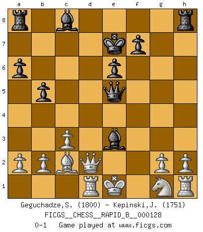 Last move : 0-1 2010 February 4 20:19:14 [Event "FICGS__CHESS__RAPID_B__000128"] [Site "FICGS"] [Date "2009.10.09"] [Round "1"] [White "Geguchadze,Sandro"] [Black "Kepinski,Janusz"] [Result "0-1"] [WhiteElo "1800"] [BlackElo "1751"] 1.e4 e6 2.d4 d5 3.Nc3 Nf6 4.e5 Ne4 5.Nxe4 dxe4 6.Be3 c5 7.dxc5 Nd7 8.Qg4 Nxc5 9.Bxc5 Bxc5 10.Qxg7 Qa5+ 11.c3 Rf8 12.Qxh7 Ba3 13.Rb1 Qxe5 14.Qh6 Rh8 15.Qd2 Bc5 16.Bb5+ Ke7 17.Rd1 a6 18.Ba4 b5 19.Bc2 e3 20.fxe3 Bxe3 0-1 This chess game has been lost on time (started : 2009.10.09 10:59:58) French : Steinitz variation Player Black won this chess game. Follow this game move after move (download)We don't really know how the game was invented, though there are suspicions. As soon as we discover the culprits, we'll let you know. (Bruce Pandolfini) Ich brauche nur einen Blick auf das Schachbrett zu werfen, und weiß schon, was in der Stellung steckt, was geschehen kann und was geschehen wird. Alle übrigen suchen und prüfen, ich aber weiß es! (José Raúl Capablanca) Morphy probablemente fue el genio más grande de todos. (Bobby Fischer) Dans le domaine de la peinture, de la gravure et de la sculpture, dès la première décennie de notre siècle, les artistes abandonnent la représentation de la partie d'échecs pour se concentrer sur les pièces, sur les échiquiers et sur toutes les variations auxquelles les unes et les autres peuvent donner lieu. On passe en quelque sorte d'un thème social à un thème musical (au sens de la musica médiévale, c'est-à-dire d'une notion qui inclue le rythme, l'harmonie, la construction et la déconstruction, etc.). Graphiquement et picturalement, l'échiquier apparaît comme une structure ouverte, dynamique, d'une richesse infinie, autorisant toutes les combinatoires et débouchant sur des mouvements et des rythmes de nature exponentielle. (Michel Pastoureau) Mac users swear by their computers. PC users swear at their computers. (Author unknown)