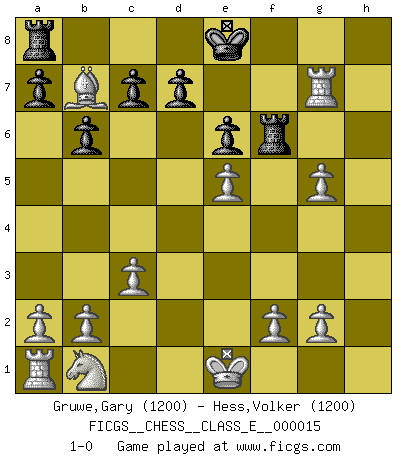 Last move : 1-0 2006 October 13 17:18:11 [Event "FICGS__CHESS__CLASS_E__000015"] [Site "FICGS"] [Date "2006.09.28"] [Round "1"] [White "Gruwe,Gary"] [Black "Hess,Volker"] [Result "1-0"] [WhiteElo "1200"] [BlackElo "1200"] 1.d4 e6 2.Nf3 f5 3.Bg5 Be7 4.h4 Bxg5 5.hxg5 Ne7 6.Qd3 O-O 7.e4 fxe4 8.Qxe4 Nbc6 9.Qxh7+ Kf7 10.Ne5+ Nxe5 11.dxe5 Ng6 12.Qh5 b6 13.Bd3 Bb7 14.Qxg6+ Ke7 15.Rh7 Rf7 16.Rxg7 Qf8 17.Qf6+ Ke8 18.Bg6 Qb4+ 19.c3 Qe4+ 20.Bxe4 Rxf6 21.Bxb7 1-0 Queen's pawn Kingside Castling by player Black (move 6) Player White won this chess game. Follow this game move after move (download)Man is a frivolous, a specious creature, and like a Chess player, cares more for the process of attaining his goal than for the goal itself. (Dostoyevsky) Kritik überlasse ich den Spießern. Ich zeige nichts, wofür ich mich schämen muss. (Alexandra Kosteniuk) Alguna parte de un error es siempre correcto. (Savielly Tartakover) En blitz, le Cavalier l'emporte sur le Fou. (Vlastimil Hort) Somehow our devils are never quite what we expect when we meet them face to face. (Nelson DeMille)