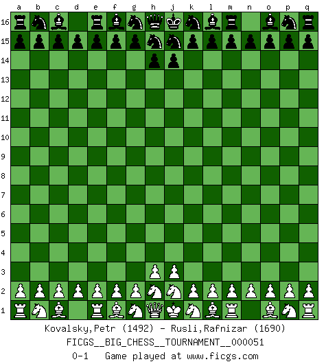 Last move : 0-1 2009 October 9 22:51:20 [Event "FICGS__BIG_CHESS__TOURNAMENT__000051"] [Site "FICGS"] [Date "2009.10.09"] [Round "1"] [White "Kovalsky,Petr"] [Black "Rusli,Rafnizar"] [Result "0-1"] [WhiteElo "1492"] [BlackElo "1690"] 0-1 Follow this game move after move (download)The laws of Chess do not permit a free choice: you have to move whether you like it or not. (Emanuel Lasker) Taktik ist was man tun muß, wenn etwas zu tun ist. Strategie ist was man tun muß, wenn nichts zu tun ist. (Savielly Grigorievitsch Tartakower) El Ajedrez es sobre todo, ¡una pelea!. (Emanuel Lasker) Ce n'est pas pour s'amuser qu'il joue aux échecs : il célèbre un culte. (Vladimir Nabokov) You cannot beat a roulette table unless you steal money from it. (Albert Einstein)