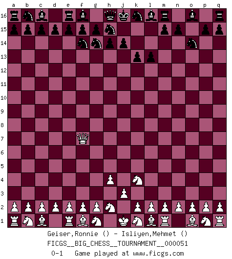 Last move : 0-1 2009 October 24 6:8:1 [Event "FICGS__BIG_CHESS__TOURNAMENT__000051"] [Site "FICGS"] [Date "2009.10.09"] [Round "1"] [White "Geiser,Ronnie"] [Black "Isliyen,Mehmet"] [Result "0-1"] [WhiteElo ""] [BlackElo ""] 1.h3-h4 l15-l13 2.j2-k4 k15-k13 3.h1-o7 j15-g14 4.o7-o15 p16-o14 5.o15-f7 g16-f14 0-1 Follow this game move after move (download)Chess is everything: art, science and sport. (Anatoly Karpov) Ein Springer auf f6 gegen die eigene Rochadestellung ist schlimmer als ein rostiger Nagel im Knie. (Efim Bogoljubov) El juego de Fischer siempre fue nítido, racional y brillante. Uno de los mejores por siempre. (Dave Regis) Les échecs, c'est l'imagination. (David Bronstein) Treat your password like your toothbrush. Don't let anybody else use it, and get a new one every six months. (Clifford Stoll)