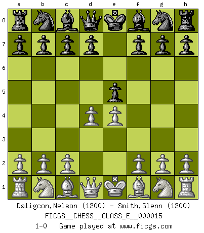 Last move : 1-0 2006 November 11 4:1:52 [Event "FICGS__CHESS__CLASS_E__000015"] [Site "FICGS"] [Date "2006.09.28"] [Round "1"] [White "Daligcon,Nelson"] [Black "Smith,Glenn"] [Result "1-0"] [WhiteElo "1200"] [BlackElo "1200"] 1.e4 e5 2.d4 1-0 This chess game has been lost on time (started : 2006.09.28 13:54:40) King's pawn game Player White won this chess game. Follow this game move after move (download)It is always better to sacrifice your opponent's men. (Savielly Tartakower) Ich bin der einzige Schachspieler, der sich während der Vorbereitungen zum Turnier verletzt hat. (Woody Allen) No hay un Gran Maestro de Ajedrez que sea normal; solo se diferencían ellos por la magnitud de su locura. (Viktor Korchnoi) Comme les marins qui ont mille raisons différentes d'aller en mer, les joueurs d'échecs en ont tout autant avant de s'installer devant une table et jouer... (Vincent Bertignac, philosophe) I take risks, sometimes patients die, but not taking risks causes more patients to die. So I guess my biggest problem is I've been cursed with the ability to do the math. (Gregory House, House M.D.)