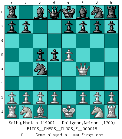 Last move : 0-1 2006 December 9 5:35:7 [Event "FICGS__CHESS__CLASS_E__000015"] [Site "FICGS"] [Date "2006.09.28"] [Round "1"] [White "Selby,Martin"] [Black "Daligcon,Nelson"] [Result "0-1"] [WhiteElo "1400"] [BlackElo "1200"] 1.e4 c5 2.Bc4 Nc6 3.Qf3 Ne5 4.Qf4 Nxc4 5.e5 d5 0-1 Sicilian defense Player Black won this chess game. Follow this game move after move (download)The isolated Pawn casts gloom over the entire chessboard. (Aaron Nimzovich) Ich kämpfe solange mein Gegner einen Fehler machen kann. (Emanuel Lasker) Puntos débiles o agujeros en la posición de tu oponente deben de ser ocupados por piezas, no Peones. (Siegbert Tarrasch) Si le désir cupide (et stupide) de gagner est une inépuisable source de souffrance, une combinaison brillante sur l'échiquier est une découverte : le coquelicot qui s'épanouit lorsque apparaît la Voie Lactée. (Arrabal) Gambling : The sure way of getting nothing from something. (Wilson Mizner)
