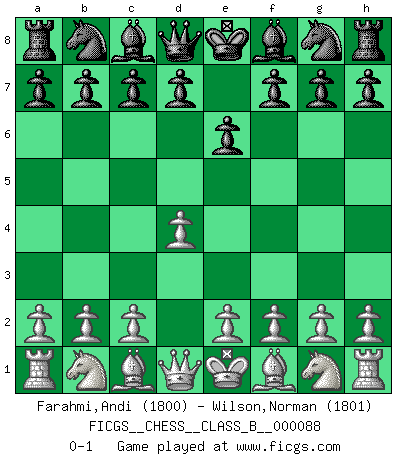 Last move : 0-1 2009 November 20 20:33:44 [Event "FICGS__CHESS__CLASS_B__000088"] [Site "FICGS"] [Date "2009.10.11"] [Round "1"] [White "Farahmi,Andi"] [Black "Wilson,Norman"] [Result "0-1"] [WhiteElo "1800"] [BlackElo "1801"] 1.d4 e6 0-1 This chess game has been lost on time (started : 2009.10.11 7:29:56) Queen's pawn Player Black won this chess game. Follow this game move after move (download)Chess is life. (Bobby Fischer) Ein Kibitz ist einer, der deinem Gegner gute Ratschläge gibt. (Andrew Soltis) Alekhine es un poeta que crea un trabajo de arte de algo que raramente inspiraría a otra persona a mandar una tarjeta postal. (Max Euwe) Fischer est le meilleur joueur du monde et Karpov n'est qu'un joueur de bistrot. (Garry Kasparov, agé de 16 ans) May the force be with you. (Han Solo in Star Wars ep.4)