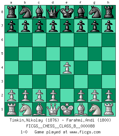Last move : 1-0 2009 December 3 8:52:18 [Event "FICGS__CHESS__CLASS_B__000088"] [Site "FICGS"] [Date "2009.10.11"] [Round "1"] [White "Timkin,Nikolay"] [Black "Farahmi,Andi"] [Result "1-0"] [WhiteElo "1876"] [BlackElo "1800"] 1.e4 1-0 This chess game has been lost on time (started : 2009.10.11 7:29:56) King's pawn Opening Player White won this chess game. Follow this game move after move (download)Chess is a part of culture and if a culture is declining then Chess too will decline. (Mikhail Botvinnik) Es gibt Leute, die glauben, alles wäre vernünftig, was man mit einem ernsthaften Gesicht tut. (Georg Christoph Lichtenberg) Si un gobernante no entiende al Ajedrez, ¿como puede governar él un reinado?. (El Rey Khusros II) Tous ces prétendus hommes politiques sont les pions, les Cavaliers, les Tours ou les Fous d'une partie d'échecs qui se jouera tant qu'un hasard ne renversera pas l'échiquier. (Honoré de Balzac) No enterprise is more likely to succeed than one concealed from the enemy until it is ripe for execution. (Niccolo Machiavelli)