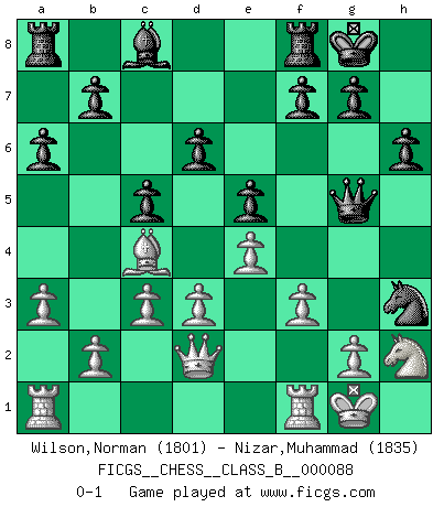 Last move : 0-1 2010 January 4 8:41:46 [Event "FICGS__CHESS__CLASS_B__000088"] [Site "FICGS"] [Date "2009.10.11"] [Round "1"] [White "Wilson,Norman"] [Black "Nizar,Muhammad"] [Result "0-1"] [WhiteElo "1801"] [BlackElo "1835"] 1.e4 c5 2.Nf3 d6 3.Nc3 e5 4.Bb5+ Nc6 5.O-O Nf6 6.d3 Be7 7.Nd5 O-O 8.Nxe7+ Nxe7 9.Bg5 Nd7 10.c3 a6 11.Bc4 h6 12.Bxe7 Qxe7 13.a3 Nf6 14.h3 Nh5 15.Nh2 Nf4 16.Qd2 Qg5 17.f3 Nxh3+ 0-1 Sicilian Kingside Castling by player White (move 5) Kingside Castling by player Black (move 7) Player Black won this chess game. Follow this game move after move (download)In blitz, the Knight is stronger than the Bishop. (Vlastimil Hort) Ich spiele ehrlich und spiele, um zu gewinnen. Wenn ich verliere nehme ich meine Medizin. (Robert James Fischer) Fischer deseaba darle a los Rusos una sopa de su propia medicina. (Larry Evans) Le moment que je préfère le plus dans une rencontre, c'est celui où je sens que la personnalité de l'adversaire se brise. (Robert Fischer) The meaning of life is that it is to be lived, and it is not to be traded and conceptualized and squeezed into a pattern of systems. (Bruce Lee)