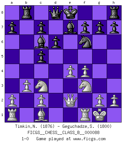 Last move : 1-0 2010 March 8 21:39:28 [Event "FICGS__CHESS__CLASS_B__000088"] [Site "FICGS"] [Date "2009.10.11"] [Round "1"] [White "Timkin,Nikolay"] [Black "Geguchadze,Sandro"] [Result "1-0"] [WhiteElo "1876"] [BlackElo "1800"] 1.e4 e5 2.Nf3 Nc6 3.Bb5 d6 4.d4 exd4 5.Nxd4 Bd7 6.Nc3 Be7 7.Bxc6 bxc6 8.O-O Rb8 9.f4 c5 10.Nf3 Bc6 11.Qe2 Nf6 12.b3 1-0 This chess game has been lost on time (started : 2009.10.11 7:29:56) Ruy Lopez : Old Steinitz defense Kingside Castling by player White (move 8) Player White won this chess game. Follow this game move after move (download)The King is a fighting piece. Use it ! (Wilhelm Steinitz) Es ist besser die Steine des Gegners zu opfern. (Savielly Grigorievitsch Tartakower) Me siento como si fuera una pieza en una partida de Ajedrez, cuando mi oponente me indica: esa pieza no puede ser movida. (Soren Kierkegaard) Donnez-moi un Cavalier en 6e et je gagnerais toutes mes parties. (Steinitz) Gambling is the son of avarice and the father of despair. (French proverb)