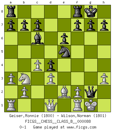 Last move : 0-1 2009 November 5 8:43:16 [Event "FICGS__CHESS__CLASS_B__000088"] [Site "FICGS"] [Date "2009.10.11"] [Round "1"] [White "Geiser,Ronnie"] [Black "Wilson,Norman"] [Result "0-1"] [WhiteElo "1800"] [BlackElo "1801"] 1.e4 Nc6 2.Nf3 Nf6 3.Nc3 d5 4.e5 d4 5.Ne2 Ng4 6.d3 e6 7.Bg5 Qd5 8.c4 Bb4+ 9.Bd2 Qc5 10.a3 Bxd2+ 11.Nxd2 Qxe5 12.Nf3 Qf6 13.Ng3 O-O 14.Be2 Bd7 15.O-O Qh6 16.h3 Nge5 17.Nxe5 Nxe5 18.Ne4 Bc6 19.Nd2 Qg6 20.Nb3 Qxg2+ 0-1 KP : Nimzovich defense Kingside Castling by player Black (move 13) Kingside Castling by player White (move 15) Player Black won this chess game. Follow this game move after move (download)Morphy was probably the greatest genius of them all. (Bobby Fischer) Wenn ich gewinne bin ich ein Genie. Wenn nicht, dann bin ich keines. (Robert James Fischer) Por tratar de evitar la pérdida de una pieza, muchas personas han perdido una partida de Ajedrez. (Savielly Tartakover) On croit qu'il y a plus de mauvais joueurs que de bons joueurs, c'est faux : Il y a autant de joueurs qui gagnent que de joueurs qui perdent. (Philippe Geluck) O divine art of subtlety and secrecy! Through you we learn to be invisible, through you inaudible and hence we can hold the enemy's fate in our hands. (Sun Tzu)