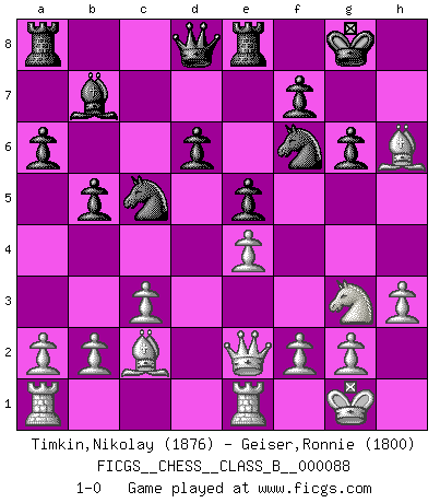 Last move : 1-0 2010 February 11 8:31:1 [Event "FICGS__CHESS__CLASS_B__000088"] [Site "FICGS"] [Date "2009.10.11"] [Round "1"] [White "Timkin,Nikolay"] [Black "Geiser,Ronnie"] [Result "1-0"] [WhiteElo "1876"] [BlackElo "1800"] 1.e4 e5 2.Nf3 Nc6 3.Bb5 a6 4.Ba4 Nf6 5.O-O b5 6.Bb3 Be7 7.Re1 O-O 8.c3 d6 9.h3 h6 10.d4 Bb7 11.d5 Na5 12.Bc2 c6 13.dxc6 Nxc6 14.Nbd2 Re8 15.Nf1 Nb8 16.Ng3 Nbd7 17.Nh4 Nc5 18.Nhf5 Bf8 19.Qe2 g6 20.Nxh6+ Bxh6 21.Bxh6 1-0 Ruy Lopez : 5.O-O Kingside Castling by player White (move 5) Kingside Castling by player Black (move 7) Player White won this chess game. Follow this game move after move (download)The chessboard is the world, the pieces are the phenomena of the Universe, the rules of the game are what we call the laws of Nature and the player on the other side is hidden from us. (Thomas Huxley) Es ist wirklich schade, dass so viele Schachspieler nicht auf ihr Äußeres achten! (Alexandra Kosteniuk) Coloca el contenido del tablero de Ajedrez en un sombrero, agita las piezas vigorosamente, derrámalas en el tablero desde una altura de medio metro y así obtienes el estilo de Wilhelm Steinitz. (H. E. Bird) Il vaut mieux sacrifier les pièces de l'adversaire. (Xavier Tartacover) I would love to change the world, but they won't give me the source code. (Unknown)
