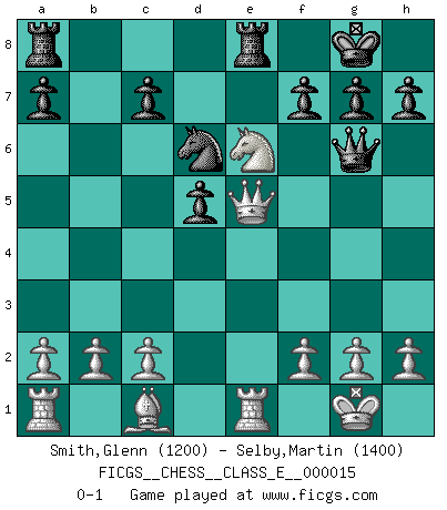 Last move : 0-1 2006 December 1 16:31:54 [Event "FICGS__CHESS__CLASS_E__000015"] [Site "FICGS"] [Date "2006.09.28"] [Round "1"] [White "Smith,Glenn"] [Black "Selby,Martin"] [Result "0-1"] [WhiteElo "1200"] [BlackElo "1400"] 1.e4 e5 2.Nf3 Nc6 3.d4 Bb4+ 4.Nc3 d5 5.Bb5 exd4 6.Nxd4 Qd6 7.O-O Qg6 8.Bxc6+ bxc6 9.Qd3 Nf6 10.Nxc6 Bxc3 11.Qxc3 Nxe4 12.Qe5+ Be6 13.Re1 Nd6 14.Nd4 O-O 15.Nxe6 Rfe8 0-1 Scotch Opening Kingside Castling by player White (move 7) Kingside Castling by player Black (move 14) Player Black won this chess game. Follow this game move after move (download)The essence of Chess is thinking about what Chess is. (David Bronstein) Ich bin stolz ein Bulgare zu sein. (Veselin Topalov) Una de estas pequeñas movidas modestas pudieran ser mas molestas a tu oponente que la amenaza mas grande. (Siegbert Tarrasch) Roi des jeux et jeu des rois, les échecs portent en eux un sentiment d'infini. Ils donnent à celui qui s'est efforcé d'en approfondir les arcanes l'impression de n'être pas à la mesure de l'homme; en fait, ils constituent un résumé de l'univers, un microcosme, et figurent cette grande échelle qui, dans les plans de la lumière descend jusqu'à la matière, qui des abîmes insondables remonte jusqu'en l'infini de Dieu. (Pyrame) There are three kinds of lies: lies, damned lies and statistics. (Mark Twain)
