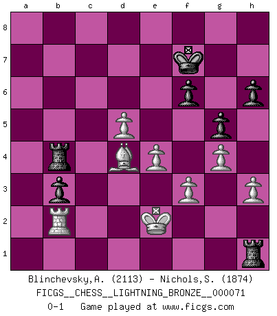 Last move : 0-1 2009 October 11 21:7:21 [Event "FICGS__CHESS__LIGHTNING_BRONZE__000071"] [Site "FICGS"] [Date "2009.10.11"] [Round "1"] [White "Blinchevsky,Alexander"] [Black "Nichols,Scott"] [Result "0-1"] [WhiteElo "2113"] [BlackElo "1874"] 1.d4 d5 2.c4 c6 3.Nf3 Nf6 4.Nc3 e6 5.e3 Nbd7 6.Qc2 Bd6 7.g4 h6 8.Bd2 b5 9.cxd5 exd5 10.a4 b4 11.Nxd5 cxd5 12.Qc6 Rb8 13.Qxd6 Ne4 14.Qc6 O-O 15.Be2 Re8 16.Rc1 Nb6 17.Qc7 Qxc7 18.Rxc7 Nxa4 19.Ne5 Nxb2 20.f3 Nd6 21.Rxa7 Rb6 22.Kf2 Nbc4 23.Nxc4 dxc4 24.Rb1 b3 25.h3 Be6 26.e4 Nb5 27.Ra4 Reb8 28.d5 Bd7 29.Rxc4 Na3 30.Rb2 Nxc4 31.Bxc4 Bb5 32.Bxb5 Rxb5 33.Ke2 Ra8 34.Kd3 Ra2 35.Kc3 g5 36.Be3 f6 37.Bc1 Kf7 38.Be3 Ra1 39.Kd3 Rd1+ 40.Ke2 Rh1 41.Bd4 Rb4 0-1 QGD Slav : 4.Nc3 Kingside Castling by player Black (move 14) Player Black won this chess game. Follow this game move after move (download)Chess is like war on a board. (Bobby Fischer) Es gibt nur zwei wahre Schachgenies - das andere war Wilhelm Steinitz, der Weltmeister von 1872 bis 1894. (Robert James Fischer) El ganar no lo es todo... pero el perder es nada. (Mednis) C'est une question de caractère, Beaucoup de gens perdent leur motivation très vite. D'autres, ils sont rares, peuvent la conserver très longtemps. J'aime les échecs, encore aujourd'hui je suis heureux d'analyser des parties. J'aime toujours gagner, je déteste encore perdre. Bien jouer est important pour mon intégrité intellectuelle et morale. Et puis les échecs vivent en ce moment une période historique grâce à Internet. Ils se développent dans les systèmes éducatifs à travers le monde. Ils sortent de leur ghetto, et c'est mon rôle de mener à bien cette révolution. (Gary Kasparov) When the going gets tactical, the computers get going. (Hyatt)