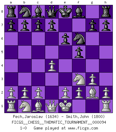 Last move : 1-0 2009 December 28 20:15:28 [Event "FICGS__CHESS__THEMATIC_TOURNAMENT__000094"] [Site "FICGS"] [Date "2009.10.12"] [Round "1"] [White "Pech,Jaroslav"] [Black "Smith,John"] [Result "1-0"] [WhiteElo "1634"] [BlackElo "1800"] 1.d4 f5 2.Nf3 e6 3.g3 Nf6 4.Bg2 1-0 This chess game has been lost on time (started : 2009.10.12 0:5:1) Dutch Player White won this chess game. Follow this game move after move (download)Strategy requires thought, tactics require observation. (Max Euwe) Im Spitzenschach von heute geht es nur um Vorbereitung, um tiefgründige, sorgfältige Eröffnungsvorbereitung. (Nigel Short) En la vida, como en el Ajedrez, los Peones propios obstruyen nuestro camino. La gran fortuna de un hombre, su comodidad, placer, hijos, libros, que deberían ayudarle a ganar, con mucha frecuencia lo ponen en Jaque Mate. (Charles Buxton) Les pièces de l'échiquier étaient impitoyables. Elles le retenaient, elles l'absorbaient. Il y avait de l'horreur en cela, mais aussi une harmonie unique. Car, qu'y a-t-il dans le monde, à part les échecs ? (V. Nabokov) Thus, what is of supreme importance in war is to attack the enemy's strategy. (Sun Tzu)