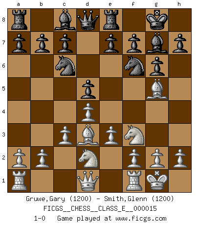Last move : 1-0 2006 November 10 3:57:16 [Event "FICGS__CHESS__CLASS_E__000015"] [Site "FICGS"] [Date "2006.09.28"] [Round "1"] [White "Gruwe,Gary"] [Black "Smith,Glenn"] [Result "1-0"] [WhiteElo "1200"] [BlackElo "1200"] 1.d4 d5 2.Nf3 Nc6 3.c3 Nf6 4.Bg5 g6 5.Nbd2 Bg7 6.e3 O-O 7.Bd3 Re8 8.O-O 1-0 This chess game has been lost on time (started : 2006.09.28 13:54:40) Queen's pawn game, Chigorin variation Kingside Castling by player Black (move 6) Kingside Castling by player White (move 8) Player White won this chess game. Follow this game move after move (download)Mistrust is the most necessary characteristic of the Chess player. (Siegbert Tarrasch) Kasparov stellt für gewöhnlich die Regeln auf und bricht sie dann selbst wieder. (Alexej Shirov) La captura del Rey enemigo es la finalidad pero no el primer objetivo de la partida. (William Steinitz) Vous n'êtes pas toujours obligé de jouer le meilleur coup. Un coup doit être actif, entreprenant, correct et beau ! (David Bronstein) Creativity is allowing yourself to make mistakes. Art is knowing which ones to keep. (Scott Adams)