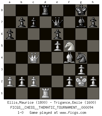 Last move : 1-0 2009 November 8 9:39:4 [Event "FICGS__CHESS__THEMATIC_TOURNAMENT__000094"] [Site "FICGS"] [Date "2009.10.12"] [Round "1"] [White "Ellis,Maurice"] [Black "Trigance,Emile"] [Result "1-0"] [WhiteElo "1800"] [BlackElo "1600"] 1.d4 f5 2.g3 Nf6 3.Bg2 g6 4.Nc3 Bg7 5.Nf3 O-O 6.O-O d5 7.Bf4 Nc6 8.Qd3 a6 9.Ne5 Nxe5 10.dxe5 Ng4 11.Qxd5+ e6 12.Qc5 Rb8 13.Qa7 Bd7 14.Rad1 Qc8 15.Qd4 Rd8 16.e4 Bc6 17.Qc5 Bf8 18.Rxd8 Qxd8 19.Qc4 Qe8 20.exf5 gxf5 21.Rd1 Bxg2 22.Kxg2 Qe7 23.Ne2 Bg7 24.Nd4 Rd8 25.Nxf5 1-0 Dutch defense Kingside Castling by player Black (move 5) Kingside Castling by player White (move 6) Player White won this chess game. Follow this game move after move (download)An attack on the wing should be met by play in the center. (Nimzovitch) Ich bewundere Kasparows phantasievolle Angriffssiege aus den Achtzigern und Neunzigern, aber wenn man sie mit dem Computer überprüft, nimmt der Computer in jeder zweiten Partie die Opfer an, verteidigt sich und gewinnt. (Vladimir Kramnik) Un entendimiento minucioso de las típicas continuaciones de mate hacen de las mas complicadas combinaciones de sacrificio que conducen hacia ellas no solo no dificiles, sino casi un asunto de rutina. (Siegbert Tarrasch) Un journaliste : 'Vous préférez avoir une dame de plus sur l'échiquier ou au lit ?' Boris Spassky : 'Ca dépend de la position.' All the biggest technological inventions created by man - the airplane, the automobile, the computer - says little about his intelligence, but speaks volumes about his laziness. (Mark Kennedy)