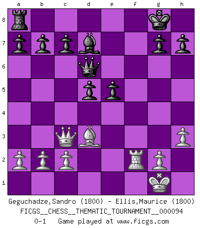 Last move : 0-1 2010 February 19 21:2:39 [Event "FICGS__CHESS__THEMATIC_TOURNAMENT__000094"] [Site "FICGS"] [Date "2009.10.12"] [Round "1"] [White "Geguchadze,Sandro"] [Black "Ellis,Maurice"] [Result "0-1"] [WhiteElo "1800"] [BlackElo "1800"] 1.d4 f5 2.Nf3 Nf6 3.Bg5 e6 4.e4 fxe4 5.Ne5 Be7 6.Nc3 O-O 7.Bxf6 Bxf6 8.Nxe4 Bxe5 9.dxe5 Nc6 10.Qd2 Qh4 11.Bd3 Nxe5 12.Ng3 d5 13.O-O Bd7 14.Rae1 Ng4 15.h3 Nxf2 16.Rxf2 Qxg3 17.Ref1 Rxf2 18.Rxf2 Qd6 19.Qc3 e5 0-1 This chess game has been lost on time (started : 2009.10.12 0:5:1) Dutch Kingside Castling by player Black (move 6) Kingside Castling by player White (move 13) Player Black won this chess game. Follow this game move after move (download)Bobby Fischer is the greatest Chess player who has ever lived. (Ken Smith) Es gibt Leute, die glauben, alles wäre vernünftig, was man mit einem ernsthaften Gesicht tut. (Georg Christoph Lichtenberg) Coloca el contenido del tablero de Ajedrez en un sombrero, agita las piezas vigorosamente, derrámalas en el tablero desde una altura de medio metro y así obtienes el estilo de Wilhelm Steinitz. (H. E. Bird) Même un GMI sait rarement calculer sur plus de cinq coups une attaque à sacrifices. (Rudolf Spielmann) Real knowledge is to know the extent of one's ignorance. (Confucius)