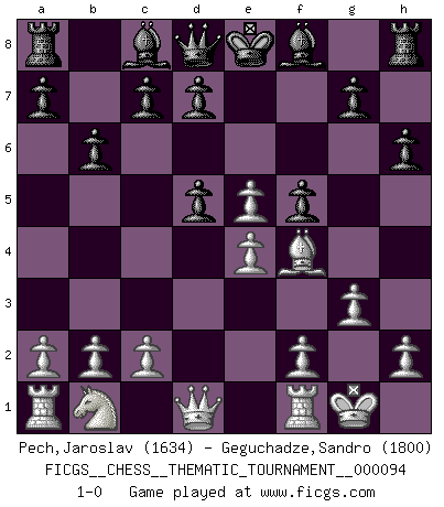 Last move : 1-0 2010 February 11 8:31:1 [Event "FICGS__CHESS__THEMATIC_TOURNAMENT__000094"] [Site "FICGS"] [Date "2009.10.12"] [Round "1"] [White "Pech,Jaroslav"] [Black "Geguchadze,Sandro"] [Result "1-0"] [WhiteElo "1634"] [BlackElo "1800"] 1.d4 f5 2.Nf3 Nf6 3.g3 e6 4.Bg2 Nc6 5.O-O b6 6.Bf4 h6 7.Ne5 Nd5 8.Bxd5 exd5 9.e4 Nxe5 10.dxe5 1-0 This chess game has been lost on time (started : 2009.10.12 0:5:1) Dutch Kingside Castling by player White (move 5) Player White won this chess game. Follow this game move after move (download)Why must I lose to this idiot ? (Aron Nimzovich) Wenn Capablanka heute auf der Schachbühne erscheinen würde, hätte er ein halbes Jahr gebraucht um sich die Schachtheorie anzueignen. Und dann hätte er alles und jeden besiegt. (Mikhail Moiseyevich Botvinik) El Ajedrez es parte de la cultura, y si una cultura esta en decadencia, entonces también el Ajedrez declinará. (Mikhail Botvinnik) Je ne crois pas en la psychologie, je crois aux bons coups. (Robert Fischer) He who is a good ruler must first have been ruled. (Aristotle)