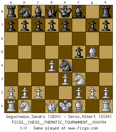 Last move : 1-0 2009 December 15 8:39:31 [Event "FICGS__CHESS__THEMATIC_TOURNAMENT__000094"] [Site "FICGS"] [Date "2009.10.12"] [Round "1"] [White "Geguchadze,Sandro"] [Black "Serov,Albert"] [Result "1-0"] [WhiteElo "1800"] [BlackElo "2034"] 1.d4 f5 2.Nf3 Nf6 3.Bg5 Ne4 4.e3 1-0 Dutch Player White won this chess game. Follow this game move after move (download)Chess is so inspiring that I do not believe a good player is capable of having an evil thought during the game. (Wilhelm Steinitz) Es hat in meinem Leben Zeiten gegeben, in denen das Schachspiel, wenn nicht zum Lebenszweck, so doch zu einem regelrechten Lebensersatz geworden ist. Man fühlt sich in solchen Zeiten nicht so, als besäße man eine göttliche Gabe, sondern eher so, als sei man von ihr besessen. (Garry Kasparov) Una victoria por una combinación errónea, aunque sea espectacular, me llena de horror artístico. (Wilhelm Steinitz) Même si l'adversaire joue le coup analysé précédemment, recommencez l'analyse en voyant la nouvelle position. Première règle de Blumenfeld If you are going through hell, keep going. (Winston Churchill)