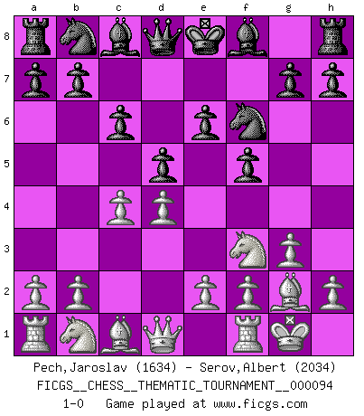 Last move : 1-0 2010 January 7 8:30:53 [Event "FICGS__CHESS__THEMATIC_TOURNAMENT__000094"] [Site "FICGS"] [Date "2009.10.12"] [Round "1"] [White "Pech,Jaroslav"] [Black "Serov,Albert"] [Result "1-0"] [WhiteElo "1634"] [BlackElo "2034"] 1.d4 f5 2.Nf3 Nf6 3.c4 e6 4.g3 d5 5.Bg2 c6 6.O-O 1-0 Dutch Kingside Castling by player White (move 6) Player White won this chess game. Follow this game move after move (download)Chess is ruthless: you've got to be prepared to kill people. (Nigel Short) Wenn du nicht weißt was du tun sollst, warte bis dein Gegner eine Idee hat. Sie wird sicher schlecht sein. (Siegbert Tarrasch) No hay precio que no valga la pena por la cabellera del Rey enemigo. (Koblentz) Aux échecs, l'amour-propre est satisfait quand on remporte la victoire, mais il n'y a pas de honte à être battu. (Benjamin Franklin) In theory there is no difference between theory and practice. In practice there is. (Yogi Berra)
