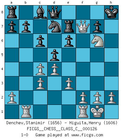 Last move : 1-0 2009 December 2 18:1:31 [Event "FICGS__CHESS__CLASS_C__000126"] [Site "FICGS"] [Date "2009.10.12"] [Round "1"] [White "Denchev,Stanimir"] [Black "Higuita,Henry"] [Result "1-0"] [WhiteElo "1656"] [BlackElo "1606"] 1.d4 d5 2.c4 e6 3.Nf3 Nc6 4.Nc3 Bb4 5.e3 Bxc3+ 6.bxc3 Nf6 7.Ba3 Ne7 8.Bd3 c6 9.O-O O-O 10.Rb1 Re8 11.Ne5 Nd7 12.Bxh7+ Kxh7 13.Qh5+ Kg8 14.Qxf7+ Kh8 15.Bxe7 Rxe7 16.Ng6+ 1-0 Queen's gambit declined Kingside Castling by player White (move 9) Kingside Castling by player Black (move 9) Player White won this chess game. Follow this game move after move (download)I love all positions. Give me a difficult positional game, I will play it. But totally won positions, I cannot stand them. (Hein Donner) Sehr viele beherrschen heutzutage das große Einmalseins des Schachspiels und kennen sogar dessen Logarithmentafeln auswendig - deshalb sollte man hin und wieder zu beweisen trachten, dass zwei mal zwei auch fünf sein kann. (Mikhail Nekhemyevich Tal) El Ajedrez es tan inspirador que yo no creo que un buen jugador sea capaz de tener un pensamiento malo durante una partida. (Wilhelm Steinitz) Les échecs c'est le défi de l'alpiniste, toujours plus haut, prêt à tout pour monter à l'assaut du Roi ennemi. Les échecs, c'est de la musique en mouvement, un ballet majestueux pour les yeux. C'est de la poésie composée par les fantômes du passé qui au même titre que Rimbaud ou Verlaine méritent notre admiration. Les échecs, c'est de la peinture ou le moindre mouvement modifie le tableau pour en faire un Picasso ou un Van Gogh. Les échecs, c'est tout et rien, c'est la vie et la mort. Jjulie33 sur le forum de France-Echecs. After growing wildly for years, the field of computing appears to be reaching its infancy. (John Pierce)