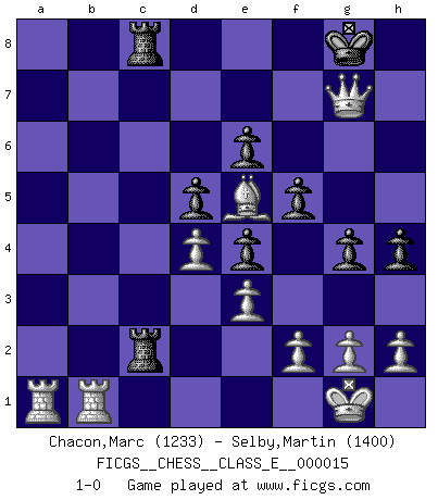 Last move : 1-0 2006 October 2 13:24:7 [Event "FICGS__CHESS__CLASS_E__000015"] [Site "FICGS"] [Date "2006.09.28"] [Round "1"] [White "Chacon,Marc"] [Black "Selby,Martin"] [Result "1-0"] [WhiteElo "1233"] [BlackElo "1400"] 1.d4 d5 2.c4 e6 3.Nf3 Nc6 4.Nc3 Bd6 5.c5 Be7 6.Bf4 Nf6 7.e3 Ne4 8.Bb5 a6 9.Bxc6+ bxc6 10.Nxe4 dxe4 11.Ne5 Qd5 12.O-O Rb8 13.b3 O-O 14.Qc2 Rb4 15.Qc3 a5 16.a3 Rxb3 17.Qxa5 Bd6 18.Nxc6 Qxc6 19.Rfb1 Rd3 20.cxd6 cxd6 21.Qb5 Qxb5 22.Rxb5 d5 23.a4 Ba6 24.Rb6 Bc4 25.Bb8 Bb3 26.a5 Rc3 27.a6 R3c8 28.a7 f5 29.a8Q Rc2 30.Rxb3 Rfc8 31.Qa3 g5 32.Be5 h5 33.R3b1 g4 34.Qe7 h4 35.Qg7+ 1-0 Comment by player 1 : Marc Chacon : you're welcome Martin. Regards.Marc Comment by player 2 : Martin Selby : Very well played Marc. Thank you. Martin Queen's gambit declined Kingside Castling by player White (move 12) Kingside Castling by player Black (move 13) Promotion Queen by player White (move 29) Player White won this chess game. Follow this game move after move (download)Chess is a terrific way for kids to build self image and self esteem. (Saudin Robovic) Stelle das Brett so, daß die Sonne in die Augen deines Gegners scheint. (Ruy López) Me gusta decir que Bobby Fischer fue el mejor jugador que jamás haya existido. Pero lo que hizo de Fischer un genio, fue su habilidad de mezclar una frescura y pragmatismo Americano con ideas Rusas acerca de la estrategia. (Bruce Pandolfini) Des points faibles ou des trous dans la position de l'adversaire doivent être occupés par des pièces et non pas par des pions. (Siegbert Tarrasch) As a goal marker shodan is important. As a destination it is a poor place to stop. (Thomas Tamayo)
