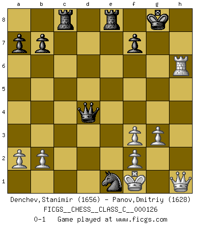 Last move : 0-1 2009 November 11 9:16:40 [Event "FICGS__CHESS__CLASS_C__000126"] [Site "FICGS"] [Date "2009.10.12"] [Round "1"] [White "Denchev,Stanimir"] [Black "Panov,Dmitriy"] [Result "0-1"] [WhiteElo "1656"] [BlackElo "1628"] 1.c4 Nf6 2.Nc3 e6 3.g3 d5 4.cxd5 exd5 5.d4 Bd6 6.Bg2 O-O 7.Bxd5 Nxd5 8.Nxd5 Bxg3 9.hxg3 Qxd5 10.Nf3 Nc6 11.Bf4 Bg4 12.Qd3 h6 13.Bxc7 Rac8 14.Bf4 Nb4 15.Qd1 Nc2+ 16.Kf1 Nxa1 17.Kg2 Bxf3+ 18.exf3 Nc2 19.Bxh6 gxh6 20.Rxh6 Rfe8 21.Qh1 Ne1+ 22.Kf1 Qxd4 0-1 English Opening Kingside Castling by player Black (move 6) Player Black won this chess game. Follow this game move after move (download)Chess is a beautiful mistress. (Bent Larsen) Je älter ich werde, um so mehr schätze ich die Bauern. (Paul Keres) Un buen jugador siempre tiene buena suerte. (José Raúl Capablanca) Si je n'étais pas joueur d'échecs, je serais le meilleur dans quelque chose d'autre. (Anatoli Karpov) To send light into the darkness of men's hearts - such is the duty of the artist. (Schumann)