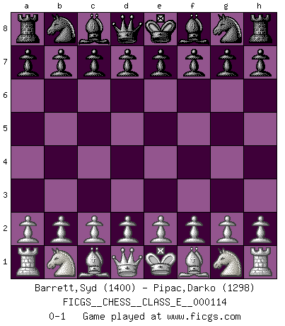Last move : 0-1 2009 November 23 20:43:23 [Event "FICGS__CHESS__CLASS_E__000114"] [Site "FICGS"] [Date "2009.10.14"] [Round "1"] [White "Barrett,Syd"] [Black "Pipac,Darko"] [Result "0-1"] [WhiteElo "1400"] [BlackElo "1298"] 0-1 This chess game has been lost on time (started : 2009.10.14 19:7:50) Player Black won this chess game. Follow this game move after move (download)We don't really know how the game was invented, though there are suspicions. As soon as we discover the culprits, we'll let you know. (Bruce Pandolfini) Die Jungen erwarten, dass Opa einfach umfällt. Dann aber kann Opa fünf Stunden lang Schach spielen und die jungen Gegner an die Wand drücken. (Viktor Kortschnoi) Estaba muy claro de que el punto vulnerable del Gran Maestro Americano (Bobby Fischer) radicaba en las posiciones de doble filo, colgantes, irracionales, donde el siempre falló en encontrar un triunfo aún en una posición de clara victoria. (Efim Geller) Ce qui est bien, c'est d'avoir tout un tas de pièces en prise : l'adversaire ne peut en prendre qu'une à la fois. Cité par Thierry Audin. They misunderestimated me. (George W. Bush, Bentonville nov. 6, 2000)