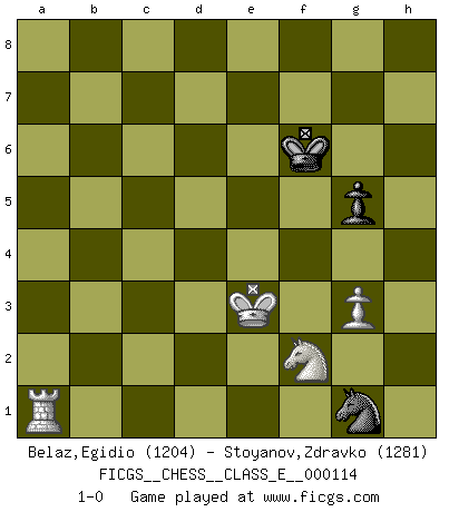 Last move : 1-0 2009 December 2 18:28:5 [Event "FICGS__CHESS__CLASS_E__000114"] [Site "FICGS"] [Date "2009.10.14"] [Round "1"] [White "Belaz,Egidio"] [Black "Stoyanov,Zdravko"] [Result "1-0"] [WhiteElo "1204"] [BlackElo "1281"] 1.e4 c5 2.Nf3 a6 3.Bc4 e6 4.d4 b5 5.Bd3 c4 6.Be2 h6 7.c3 Bd6 8.e5 Bc7 9.O-O Ne7 10.Nbd2 O-O 11.b3 Nd5 12.bxc4 bxc4 13.Bxc4 Nxc3 14.Qc2 Nd5 15.Qe4 Nc3 16.Qxa8 Nc6 17.Bxa6 Bxa6 18.Qxa6 Nb4 19.Qc4 Nbd5 20.Bb2 Ba5 21.Bxc3 Bxc3 22.Rab1 Qa5 23.Rfd1 Ra8 24.a4 Qxa4 25.Qxa4 Rxa4 26.Rb7 Bxd4 27.Nb3 Bc3 28.Nc5 Rb4 29.Rxb4 Bxb4 30.Nxd7 Nc3 31.Ra1 Ne2+ 32.Kf1 Nf4 33.Ra8+ Kh7 34.g3 Ng6 35.Ra7 Bc3 36.Nh4 Bxe5 37.Nxe5 Nxe5 38.f4 Ng4 39.Kg2 f6 40.h3 Ne3+ 41.Kf3 Nf1 42.Ra6 e5 43.fxe5 fxe5 44.Nf5 Nd2+ 45.Ke2 Ne4 46.Kf3 Ng5+ 47.Ke2 Nxh3 48.Re6 Ng1+ 49.Ke3 g6 50.Re7+ Kh8 51.Nxh6 Nh3 52.Rxe5 Kg7 53.Ng4 g5 54.Nf2 Kf6 55.Ra5 Ng1 56.Ra1 1-0 Sicilian : O'Kelly variation Kingside Castling by player White (move 9) Kingside Castling by player Black (move 10) 10 pieces endgame at move 43 : White KRNPP , Black KNPPP WHITE : King + 1 Rook 1 Knight 2 Pawns BLACK : King + 1 Knight 3 Pawns 9 pieces endgame at move 47 : White KRNP , Black KNPPP WHITE : King + 1 Rook 1 Knight 1 Pawn BLACK : King + 1 Knight 3 Pawns 8 pieces endgame at move 51 : White KRNP , Black KNPP WHITE : King + 1 Rook 1 Knight 1 Pawn BLACK : King + 1 Knight 2 Pawns 7 pieces endgame at move 52 : White KRNP , Black KNP WHITE : King + 1 Rook 1 Knight 1 Pawn BLACK : King + 1 Knight 1 Pawn Player White won this chess game. Follow this game move after move (download)The mistakes are there, waiting to be made. (Savielly Tartakower) Es genügt nicht ein guter Spieler zu sein, man muß auch gut spielen. (Siegbert Tarrasch) Un buen sacrificio es aquel que aunque no sea necesariamente sólido, deja a tu oponente aturdido y confuso. (Rudolph Spielmann) Les échecs, c'est la lutte contre l'erreur. (Johannes Zukertort) Life is like a game of cards: the hand you are dealt represents determinism; the way you play it is free will. (Jawaharlal Nehru)