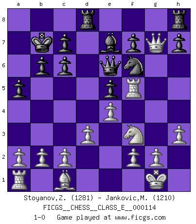 Last move : 1-0 2009 December 25 14:6:1 [Event "FICGS__CHESS__CLASS_E__000114"] [Site "FICGS"] [Date "2009.10.14"] [Round "1"] [White "Stoyanov,Zdravko"] [Black "Jankovic,Mladen"] [Result "1-0"] [WhiteElo "1281"] [BlackElo "1210"] 1.e4 e5 2.Nf3 Nc6 3.Bb5 a6 4.Bxc6 dxc6 5.d3 Bg4 6.h3 Bxf3 7.Qxf3 Qf6 8.Nd2 Be7 9.O-O O-O-O 10.Re1 b6 11.Re3 a5 12.Qg4+ Kb8 13.Rf3 Qe6 14.Qxg7 Nf6 15.Rf5 Kb7 16.Nf3 1-0 Ruy Lopez : Exchange variation Kingside Castling by player White (move 9) Queenside Castling by player Black (move 9) Player White won this chess game. Follow this game move after move (download)When you don't know what to do, wait for your opponent to get an idea - it's sure to be wrong. (Tarrasch) Bobby Fischer ist kein Vorbild für die heutige Jugend. (Viktor Kortschnoi) La última cosa en que Fischer estaba interesado era en tonterías, siempre y cuando el Ajedrez estuviera involucrado. (Elie Agur) La victoire dans une partie d'Echecs appartient la plupart du temps à celui qui voit un peu plus loin que l'adversaire. (Lasker) If you work for a living, why do you kill yourself working ? (Tuco to a chicken in The Good, The Bad and The Ugly)