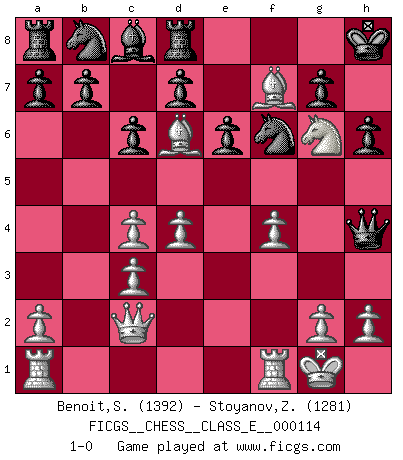 Last move : 1-0 2009 October 19 17:20:38 [Event "FICGS__CHESS__CLASS_E__000114"] [Site "FICGS"] [Date "2009.10.14"] [Round "1"] [White "Benoit,Sebastien"] [Black "Stoyanov,Zdravko"] [Result "1-0"] [WhiteElo "1392"] [BlackElo "1281"] 1.d4 c6 2.c4 e6 3.Nc3 Bb4 4.Nf3 Bxc3+ 5.bxc3 Qa5 6.Qc2 h6 7.e4 Nf6 8.e5 Nh7 9.Bd3 f5 10.exf6 Nxf6 11.Bf4 O-O 12.Bd6 Rd8 13.O-O Qh5 14.Bg6 Qg4 15.Ne5 Qg5 16.f4 Qh4 17.Bf7+ Kh8 18.Ng6+ 1-0 Queen's pawn Kingside Castling by player Black (move 11) Kingside Castling by player White (move 13) Player White won this chess game. Follow this game move after move (download)When asked, -How is that you pick better moves than your opponents?, I responded: I'm very glad you asked me that, because, as it happens, there is a very simple answer. I think up my own moves, and I make my opponent think up his. (Alexander Alekhine) Modernes Schach sorgt sich zuviel um Dinge wie Bauernstruktur usw. Vergessen Sie das, Schachmatt beendet das Spiel! (Nigel Short) Al jugar al Ajedrez entonces, podemos aprender: Primero: Previsión... Segundo: Prudencia... Tercero: Cautela... Y al final, aprendemos del Ajedrez el hábito de no ser desanimados por apariencias malas presentes en el estado de nuestros asuntos, el hábito de la esperanza por una oportunidad favorable y la perseveración de los secretos de los recursos. (Benjamin Franklin) A ce moment-là, je menaçais de comprendre la position ! (Clément L'Heureux) In fact if nothing is done against this teddy bear, hereby I announce that I would quit chess, rapid chess, blitz chess, postal chess, email chess, server chess and correspondence chess I will then switch to a table game where teddy bears aren't going to be seen for a while, like Poker, or Roulette, all 18+ games. (Elmer Valderrama)
