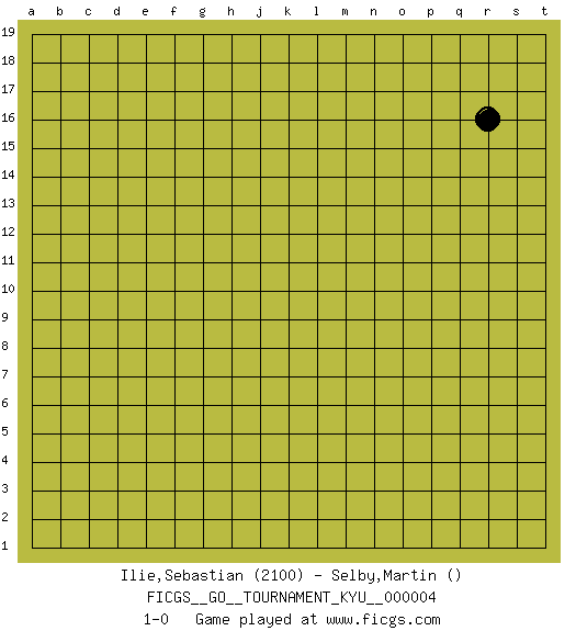 Last move : 1-0 2006 September 29 22:32:11 [Event "FICGS__GO__TOURNAMENT_KYU__000004"] [Site "FICGS"] [Date "2006.09.29"] [Round "1"] [Black "Ilie,Sebastian"] [White "Selby,Martin"] [Result "1-0"] [Rating 1 "2100"] 1.r16 1-0 Here are the names of the openings (joseki) played in the four corners : Player Black won this Go (weiqi, baduk) game. Follow this game move after move (download)Don't try to enclose an open skirt. (Anonymous) You can't play chess if you're groggy from pills. (Anatoly Karpov)