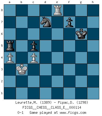 Last move : 0-1 2009 November 26 13:15:12 [Event "FICGS__CHESS__CLASS_E__000114"] [Site "FICGS"] [Date "2009.10.14"] [Round "1"] [White "Leurette,Marc-Antoine"] [Black "Pipac,Darko"] [Result "0-1"] [WhiteElo "1389"] [BlackElo "1298"] 1.e4 e5 2.Nf3 Nc6 3.d4 exd4 4.Nxd4 Nxd4 5.Qxd4 b6 6.Bc4 Qf6 7.Be3 Bc5 8.Qxf6 Nxf6 9.Bxc5 bxc5 10.Nc3 Ng4 11.f3 Ne5 12.Bb3 O-O 13.O-O-O d6 14.Nd5 Bb7 15.Nxc7 Rac8 16.Nb5 Rfd8 17.Nxa7 Ra8 18.Nb5 Ba6 19.Nc7 Be2 20.Rd2 Ra7 21.Nd5 Bc4 22.Bxc4 Nxc4 23.Ne7+ Rxe7 24.Rd3 Ne5 25.Rb3 g6 26.h4 Nd7 27.Rd1 Nf6 28.a4 d5 29.exd5 Rxd5 30.Rb8+ Kg7 31.Rc8 Rxd1+ 32.Kxd1 Ra7 33.b3 Ra5 34.g4 Nd5 35.c4 Ne3+ 36.Ke2 Nc2 37.Kd2 Nd4 38.Kd3 Nxb3 39.h5 Nd4 40.hxg6 hxg6 41.f4 Nf3 42.f5 Ne5+ 43.Kc3 Nxg4 44.fxg6 Kxg6 45.Kb3 Ne5 46.Re8 Nd7 0-1 Scotch game Kingside Castling by player Black (move 12) Queenside Castling by player White (move 13) 10 pieces endgame at move 44 : White KRPPP , Black KRNPP WHITE : King + 1 Rook 3 Pawns BLACK : King + 1 Rook 1 Knight 2 Pawns 9 pieces endgame at move 44 : White KRPP , Black KRNPP WHITE : King + 1 Rook 2 Pawns BLACK : King + 1 Rook 1 Knight 2 Pawns Player Black won this chess game. Follow this game move after move (download)In the perfect Chess combination as in a first-rate short story, the whole plot and counter-plot should lead up to a striking finale, the interest not being allayed until the very last moment. (Yates and Winter) Wenn man heute mit 14 Jahren noch kein GM ist, kann man es vergessen. (Viswanathan Anand) A través de las casillas del tablero, los Indios explican el movimiento del tiempo y la edad, las influencias mas altas que controlan el mundo y los lazos que vinculan al Ajedrez con el alma humana. (Al-Masudi) Les ravages du H expliquent la différence de niveau entre Tal et Thal [Abergel]. The difference between perseverance and obstinacy is that one comes from a strong will, and the other from a strong won't. (Henry Ward Beecher)