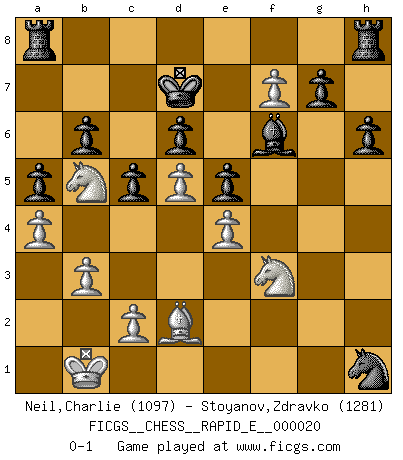 Last move : 0-1 2009 November 1 0:0:14 [Event "FICGS__CHESS__RAPID_E__000020"] [Site "FICGS"] [Date "2009.10.15"] [Round "1"] [White "Neil,Charlie"] [Black "Stoyanov,Zdravko"] [Result "0-1"] [WhiteElo "1097"] [BlackElo "1281"] 1.e4 c5 2.Nf3 Nc6 3.Nc3 a6 4.d4 b6 5.d5 Na7 6.a4 d6 7.Bd3 e5 8.Qe2 a5 9.Bd2 Bg4 10.h3 Bh5 11.g4 Bg6 12.Bb5+ Nxb5 13.Qxb5+ Qd7 14.Qxd7+ Kxd7 15.O-O-O h6 16.h4 Nf6 17.Rde1 Nxg4 18.Kb1 Nxf2 19.h5 Nxh1 20.hxg6 Ng3 21.gxf7 Be7 22.Rg1 Nh5 23.Nb5 Bf6 24.Rh1 Ng3 25.b3 Nxh1 0-1 Sicilian defense Queenside Castling by player White (move 15) Player Black won this chess game. Follow this game move after move (download)Chess problems demand from the composer the same virtues that characterize all worthwhile art: originality, invention, conciseness, harmony, complexity, and splendid insincerity. (Vladimir Nabokov) Der Partner hat auch seine Existenzberechtigung. (Savielly Grigorievitsch Tartakower) Juega la Apertura como un libro, el Juego Medio como un mago y los Finales como una máquina. (Spielmann) Celui qui prend des risques peut perdre, celui qui n'en prend pas perd toujours. (Xavier Tartacover) However beautiful the strategy, you should occasionally look at the results. (Winston Churchill)
