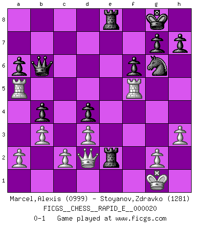 Last move : 0-1 2009 October 20 11:18:16 [Event "FICGS__CHESS__RAPID_E__000020"] [Site "FICGS"] [Date "2009.10.15"] [Round "1"] [White "Marcel,Alexis"] [Black "Stoyanov,Zdravko"] [Result "0-1"] [WhiteElo "0999"] [BlackElo "1281"] 1.f4 c5 2.Nf3 Nc6 3.e3 a6 4.b3 d5 5.Bb2 Bg4 6.Be2 e6 7.O-O Nf6 8.Nc3 b5 9.h3 Bxf3 10.Bxf3 b4 11.Ne2 Bd6 12.Ng3 O-O 13.Nh5 Nxh5 14.Bxh5 e5 15.Qg4 d4 16.fxe5 Bxe5 17.exd4 cxd4 18.d3 Qd6 19.Bc1 Bh2+ 20.Kh1 Ne5 21.Qg5 f6 22.Qd2 Nc6 23.Qf2 Bg3 24.Bf4 Bxf4 25.Qxf4 Qc5 26.Rf2 Qxh5 27.Raf1 Qc5 28.Qf3 Ne5 29.Qe4 Rae8 30.Qf4 Ng6 31.Qd2 Re3 32.Rf5 Qd6 33.Ra5 Qb6 34.R1f5 Rfe8 35.Kg1 Re2 0-1 Bird's Opening Kingside Castling by player White (move 7) Kingside Castling by player Black (move 12) Player Black won this chess game. Follow this game move after move (download)Becoming successful at Chess allows you to discover your own personality. That's what I want for the kids I teach. (Saudin Robovic) Wie kann ich Remis annehmen? Ich weiß ja gar nicht, wie ich stehe! (Fritz Sämisch) Debemos de asegurarnos de que el Ajedrez no se convierta en un lenguaje muerto, muy interesante, pero solo para un grupo muy pequeño. (Sytze Faber) Le temps de noter son nom sur la feuille de partie, j'étais déjà en zeitnot ! D'un modeste amateur apparié lors de la première ronde d'un open contre le grand-maître Azmaïparashvili. In God we trust, all others we virus scan. (Anonymous)