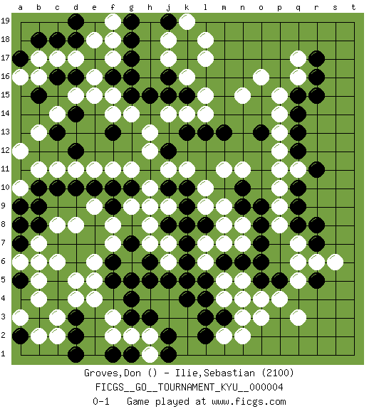 Last move : 0-1 2006 December 4 22:5:47 [Event "FICGS__GO__TOURNAMENT_KYU__000004"] [Site "FICGS"] [Date "2006.09.29"] [Round "1"] [Black "Groves,Don"] [White "Ilie,Sebastian"] [Result "0-1"] [Rating 2 "2100"] 1.c4 q3 2.d16 q17 3.k4 c14 4.q10 f17 5.d10 e15 6.r5 p4 7.n4 q6 8.r7 q7 9.q8 r6 10.r8 s6 11.q13 f3 12.r15 p15 13.h3 c3 14.d3 d4 15.b3 c2 16.d2 b4 17.c5 b2 18.a2 a3 19.d1 e4 20.f1 g2 21.g1 h2 22.a5 b5 23.g4 c6 24.d7 d5 25.c7 b7 26.b8 c11 27.c10 f7 28.a7 b6 29.b10 b11 30.a11 b13 31.f5 e6 32.h5 h7 33.k6 f11 34.f10 e11 35.e10 g11 36.e8 p12 37.q12 p11 38.q14 p14 39.r17 q16 40.r16 k11 41.j2 h1 42.j1 n3 43.m3 o3 44.k8 m11 45.h9 g9 46.g10 j9 47.g8 h8 48.f9 h10 49.g7 g6 50.f6 g9 51.e7 f8 52.o13 p13 53.q15 o16 54.j12 j14 55.k13 k14 56.m13 l14 57.l13 n15 58.d6 e5 59.d12 d11 60.d14 d15 61.f13 h13 62.g15 g14 63.f16 e16 64.g17 f18 65.d18 d17 66.c16 c17 67.h11 h12 68.j10 j11 69.k10 l10 70.k9 q11 71.r11 p10 72.q9 l7 73.j8 h9 74.h6 j7 75.k7 j6 76.j5 m2 77.g3 f2 78.g5 m4 79.l3 m5 80.p5 q5 81.o7 p8 82.m6 l6 83.l8 m7 84.n6 n5 85.l5 n7 86.o6 n8 87.o9 p9 88.o8 m9 89.n9 m8 90.n10 l9 91.k5 n11 92.l4 o4 93.o5 n4 94.l2 n2 95.c18 b17 96.b18 e18 97.b15 b16 98.a17 a16 99.c13 a12 100.d19 a10 101.a9 a6 102.a8 c8 103.b9 d8 104.g7 e9 105.h15 j17 106.g18 f19 107.g19 f15 108.g16 f14 109.j15 k16 110.k15 l15 111.k18 j18 112.j19 l17 113.k17 l18 114.j16 k19 0-1 Here are the names of the openings (joseki) played in the four corners : Corner d16 : d16 c14 Hoshi (Hwajeom, Seongjeom, Xingwei`) 4-4 Point. The star or hoshi (4-4) point, emphasizing influence at the potential expense of territory. Ikken Kakari (Hankan Keolch'im, Yi Gua`jiao~, 1-Space Low Approach). White 2 is the standard approach move to the 4-4. Corner q4 : q3 r5 Komoku (Somok, Xiao~mu`) 3-4 Point. The komoku (3-4) point is the traditional corner enclosure move.. Ikken Kakari (Hankan Keolch'im, Yi Gua`jiao~, 1-Space Low Pincer). The small knight move is the basic approach move to the 3-4 point stone. It has been continually used for over four centuries. There are limitless variations, with new moves constantly being discovered. Black 2 opens the door to a treaure store of joseki. Corner q16 : q17 q13 Komoku (Somok, Xiao~mu`) 3-4 Point. The komoku (3-4) point is the traditional corner enclosure move.. Corner d4 : c4 f3 Komoku (Somok, Xiao~mu`) 3-4 Point. The komoku (3-4) point is the traditional corner enclosure move.. Nikken Kakari (Dukan Keolch'im, E`r Gua`jiao~, 2-Space Low Approach). White 2 is used with friendly forces backing it up. Its purpose is to prevent a pincer. Locally it results in a loss, but may be appropriate fuseki strategy. It was popular in the late 1950s and early 1960s, but is not seen often nowadays, having been replaced by the one-space high approach, with which it has points in common. Player White won this Go (weiqi, baduk) game. Follow this game move after move (download)The strong player plays straight, the weak diagonally. (Anonymous) The Internet is so big, so powerful and pointless that for some people it is a complete substitute for life. (Andrew Brown)