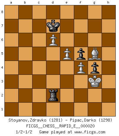 Last move : 1/2-1/2 2009 November 15 21:45:42 [Event "FICGS__CHESS__RAPID_E__000020"] [Site "FICGS"] [Date "2009.10.15"] [Round "1"] [White "Stoyanov,Zdravko"] [Black "Pipac,Darko"] [Result "1/2-1/2"] [WhiteElo "1281"] [BlackElo "1298"] 1.e4 c5 2.Nf3 Nc6 3.Bb5 Nf6 4.Bxc6 dxc6 5.d3 h6 6.h3 c4 7.Nc3 cxd3 8.Qxd3 Qxd3 9.cxd3 e6 10.a3 Bc5 11.d4 Bb6 12.Be3 Ba5 13.b4 Bc7 14.e5 Nd5 15.Nxd5 exd5 16.O-O O-O 17.Rfc1 a5 18.b5 Bd7 19.bxc6 bxc6 20.Rab1 Bf5 21.Rb7 Bd8 22.Rxc6 Bc8 23.Rb2 Re8 24.Rc5 Be7 25.Rxd5 Bxa3 26.Ra2 Bb4 27.Bd2 Be6 28.Bxb4 Bxd5 29.Rxa5 Rxa5 30.Bxa5 Bxf3 31.gxf3 f6 32.f4 f5 33.d5 Kf7 34.d6 Ke6 35.f3 Ra8 36.Bc7 Ra2 37.h4 g6 38.Bd8 Ra4 39.Kg2 Rxf4 40.Kg3 Rc4 41.Bc7 g5 42.hxg5 hxg5 43.Bd8 g4 44.f4 Rc3+ 45.Kg2 Rf3 46.Bg5 Kd7 47.Bh6 Rh3 48.Bg5 Ra3 49.Bh6 Ra2+ 50.Kg3 Rd2 51.Bg5 1/2-1/2 Sicilian : Nimzovich-Rossolimo attack (without ...d6) Kingside Castling by player White (move 16) Kingside Castling by player Black (move 16) 10 pieces endgame at move 42 : White KBPPPP , Black KRPP WHITE : King + 1 Bishop 4 Pawns BLACK : King + 1 Rook 2 Pawns 9 pieces endgame at move 42 : White KBPPP , Black KRPP WHITE : King + 1 Bishop 3 Pawns BLACK : King + 1 Rook 2 Pawns This chess game ended in a draw. Follow this game move after move (download)Castle early and often. (Rob Sillars) Frage: Gibt es etwas was Sie mehr lieben als Autobahnen ohne Tempobegrenzungen? - Antwort: Deutsche Frauen ohne Tempobegrenzungen. (Loek van Wely) Aunque la mayoría de la gente disfruta observar las partidas de los grandes Maestros de ataque, algunos de los jugadores mas notables en la historia han sido los jugadores silenciosos posicionales. Lentamente ellos te aplastan despojandote de tu espacio, congestionando tus piezas y dejandote virtualmente sin nada que hacer. (Yasser Seirawan) C'est la seule position que je connaisse où les deux camps sont mals. Propos prêtés à V. Anand. Always remember that you are unique; just like everyone else. (Unknown)