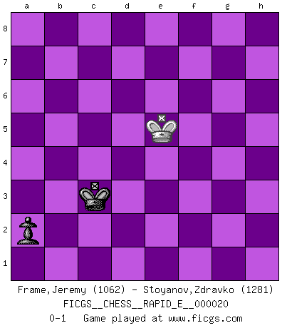 Last move : 0-1 2009 November 12 8:10:28 [Event "FICGS__CHESS__RAPID_E__000020"] [Site "FICGS"] [Date "2009.10.15"] [Round "1"] [White "Frame,Jeremy"] [Black "Stoyanov,Zdravko"] [Result "0-1"] [WhiteElo "1062"] [BlackElo "1281"] 1.e4 c5 2.Nf3 Nc6 3.c3 a6 4.d4 e6 5.d5 exd5 6.exd5 Nce7 7.c4 d6 8.b3 h6 9.Bd3 Bg4 10.Nbd2 Qa5 11.Bb2 Bf5 12.Bxf5 Nxf5 13.O-O Be7 14.Re1 Qc7 15.Qe2 O-O-O 16.g4 Nd4 17.Nxd4 cxd4 18.Bxd4 Bf6 19.Bxf6 Nxf6 20.h3 Qd7 21.f4 Rhe8 22.Qf2 Re7 23.Rxe7 Qxe7 24.Re1 Qd7 25.Ne4 Nxe4 26.Rxe4 f5 27.gxf5 Qxf5 28.Qe3 Rf8 29.Re8+ Rxe8 30.Qxe8+ Kc7 31.Qe7+ Qd7 32.Qxd7+ Kxd7 33.Kf2 Kc7 34.Ke3 Kb6 35.Kd4 Ka5 36.a3 Kb6 37.f5 a5 38.Ke4 Kc5 39.h4 b5 40.cxb5 Kxb5 41.h5 a4 42.b4 Kc4 43.f6 gxf6 44.Kf5 Kxd5 45.Kxf6 Kc4 46.Kg6 d5 47.Kxh6 d4 48.Kg7 d3 49.h6 d2 50.h7 d1Q 51.h8Q Qg4+ 52.Kf8 Qf3+ 53.Kg8 Qxa3 54.Qh4+ Kb5 55.Kf7 Qxb4 56.Qd8 a3 57.Ke6 Qb3+ 58.Ke5 a2 59.Qb8+ Kc4 60.Qc7+ Kd3 61.Qd6+ Kc2 62.Qc5+ Qc3+ 63.Qxc3+ Kxc3 0-1 Sicilian defense Kingside Castling by player White (move 13) Queenside Castling by player Black (move 15) 10 pieces endgame at move 43 : White KPPPP , Black KPPPP WHITE : King + 4 Pawns BLACK : King + 4 Pawns 9 pieces endgame at move 44 : White KPPP , Black KPPPP WHITE : King + 3 Pawns BLACK : King + 4 Pawns 8 pieces endgame at move 45 : White KPPP , Black KPPP WHITE : King + 3 Pawns BLACK : King + 3 Pawns 7 pieces endgame at move 47 : White KPPP , Black KPP WHITE : King + 3 Pawns BLACK : King + 2 Pawns Promotion Queen by player Black (move 50) Promotion Queen by player White (move 51) 6 pieces endgame at move 53 : White KQP , Black KQP WHITE : King + 1 Queen 1 Pawn BLACK : King + 1 Queen 1 Pawn 5 pieces endgame at move 55 : White KQ , Black KQP WHITE : King + 1 Queen BLACK : King + 1 Queen 1 Pawn 4 pieces endgame at move 63 : White KQ , Black KP WHITE : King + 1 Queen BLACK : King + 1 Pawn 3 pieces endgame at move 63 : White K , Black KP WHITE : King + BLACK : King + 1 Pawn Player Black won this chess game. Follow this game move after move (download)Fischer is completely natural. He plays no roles. He's like a child. Very, very simple. (Zita Rajcsanyi) Wenn ich Weiß habe gewinne ich weil ich Weiß habe, wenn ich Schwarz habe gewinne ich weil ich Bogoljubov bin. (Efim Bogoljubov) Yo no le temo a Spassky. Todos saben que yo soy el mejor. Uno no necesita un torneo para probarlo. (Bobby Fischer) J'ai toujours senti une vague pitié pour l'homme qui ne connaît rien aux échecs, tout comme j'en aurais pour un homme ignorant de l'amour. Les Echecs, comme la musique ou comme l'amour, ont le pouvoir de rendre heureux. (Siegbert Tarrasch) Memory is a way of holding onto the things you love, the things you are, the things you never want to lose. (from the television show: The Wonder Years)