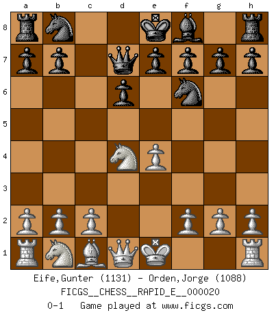 Last move : 0-1 2009 November 24 20:46:5 [Event "FICGS__CHESS__RAPID_E__000020"] [Site "FICGS"] [Date "2009.10.15"] [Round "1"] [White "Eife,Gunter"] [Black "Orden,Jorge"] [Result "0-1"] [WhiteElo "1131"] [BlackElo "1088"] 1.e4 c5 2.Nf3 d6 3.d4 cxd4 4.Nxd4 Nf6 5.Bb5+ Bd7 6.Bxd7+ Qxd7 0-1 This chess game has been lost on time (started : 2009.10.15 14:28:47) Sicilian Player Black won this chess game. Follow this game move after move (download)There are two classes of men; those who are content to yield to circumstances and who play whist; those who aim to control circumstances, and who play Chess. (Mortimer Collins) Strategie ist, wie man ein Mädchen auf den Rücksitz bekommt. Taktik ist, was man tut, wenn man dann dort ist. (Anonymous) Cuando la partida de Ajedrez termina, el Peón y el Rey regresan a la misma caja. (Irish saying) Ce n'est pas pour s'amuser qu'il joue aux échecs : il célèbre un culte. (Vladimir Nabokov) Rules and bones are meant to be broken. (Anonymous)